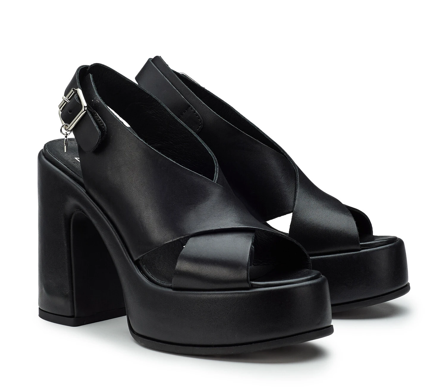 Osate catturare gli sguardi con i sandali in pelle nera realizzati da Cult per questa stagione. Si ergono su un imponente tacco a blocco personalizzato con il logo lettering laterale, presentano un generoso plateau e chiusura con fibbia metallica. Altezza tacco 12cm.