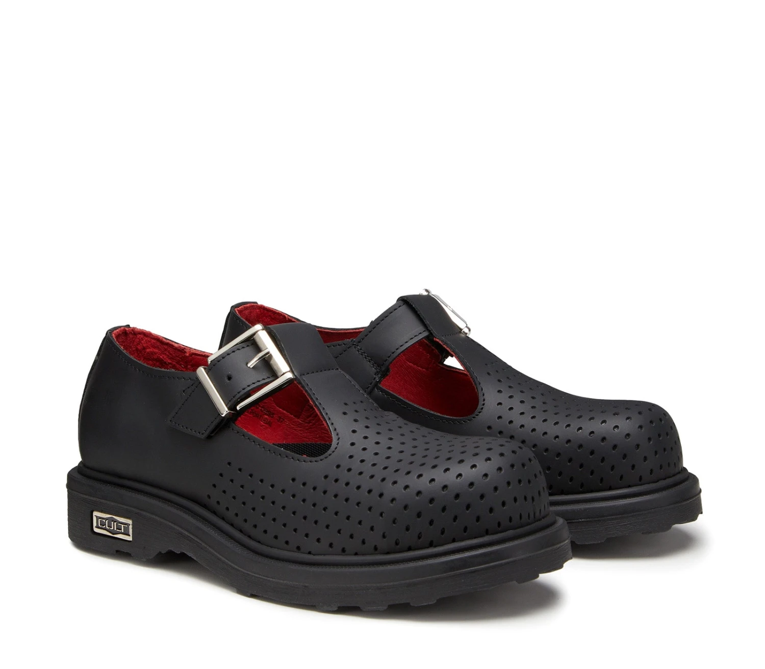 Le creazioni firmate Cult Bolt questa stagione puntano su silhouette d’archivio e motivi classici, come mostrato su questi mocassini. Realizzati in pelle nera traforata sull’iconico puntale d’acciaio, presentano un design con cinturino a T, elevato da una moderna suola platform sur ton.