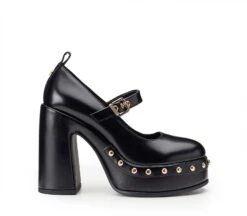 Valorizzate il vostro lato femminile con le pumps Mary Jane di Cult. Il modello presenta tacco scultoreo, spesso plateau e cinturino sul davanti ed è impreziosito con maxi borchie sferiche d’orate in stile zoccolo. Altezza tacco 12 cm