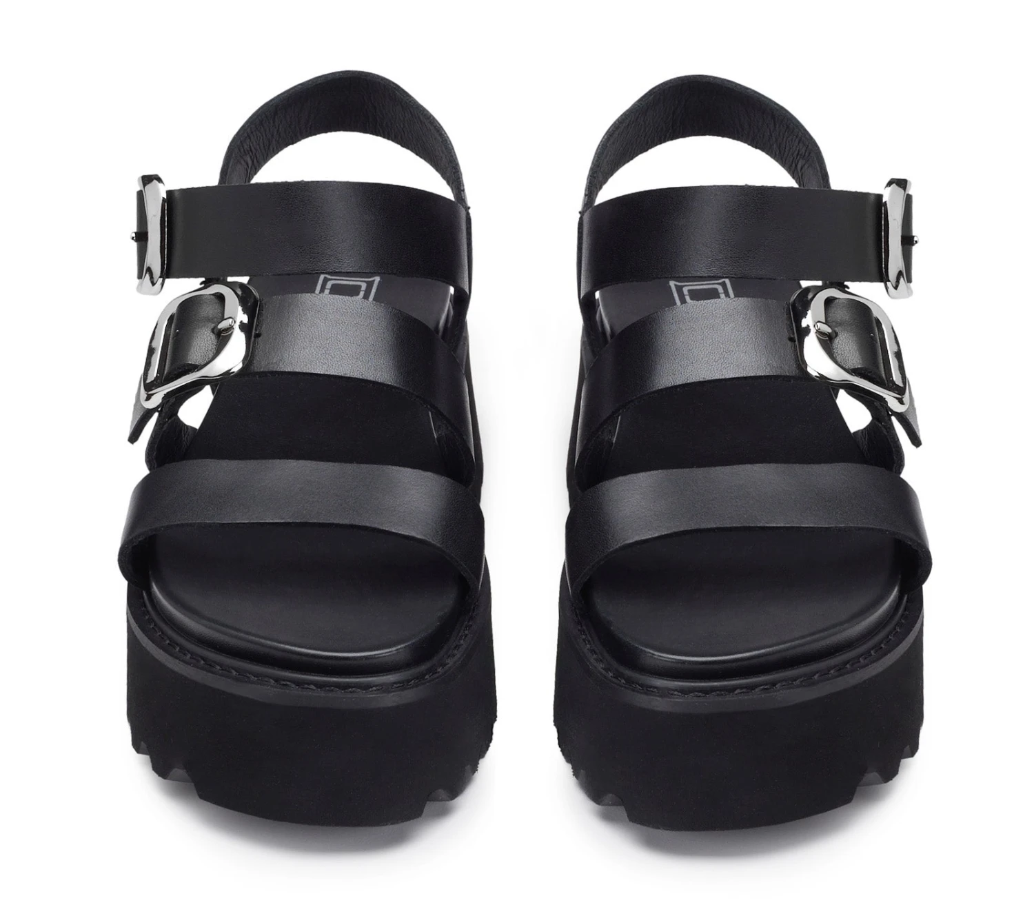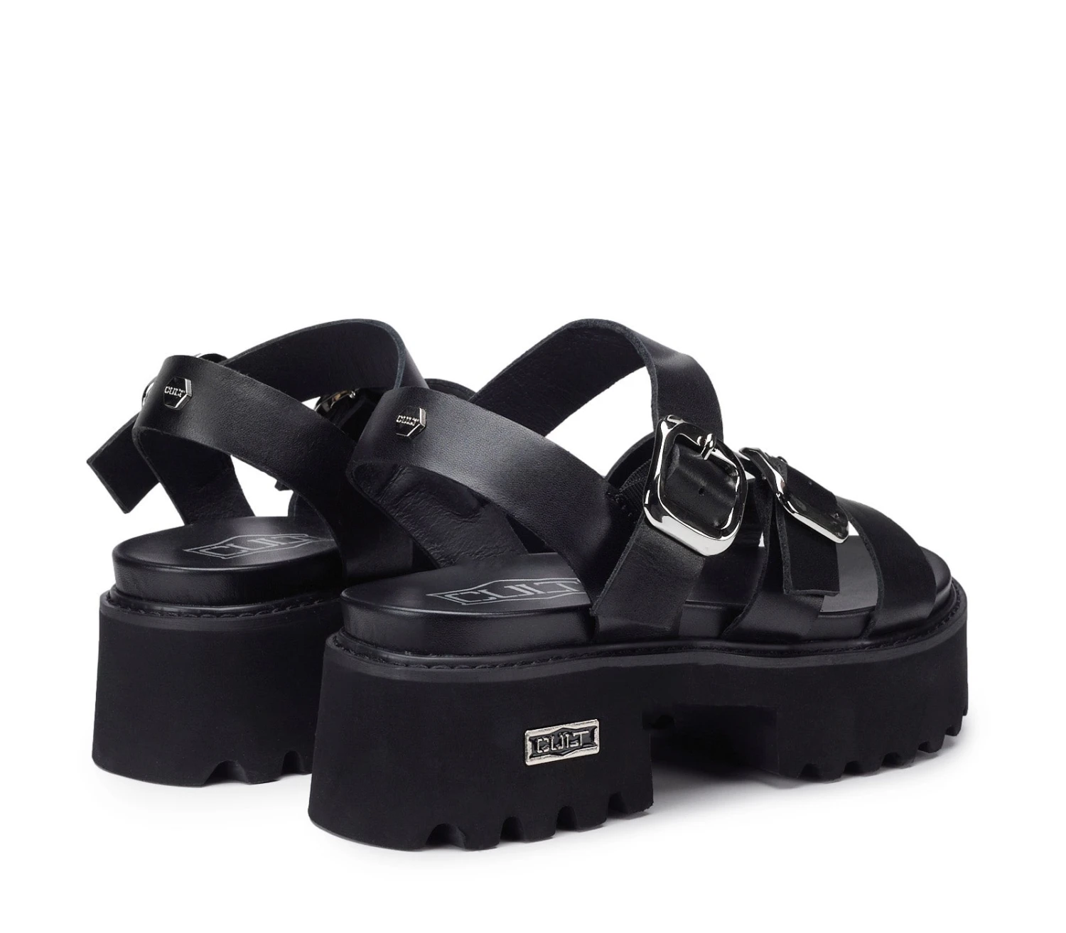 Sandalo CULT dallo stile grintoso con suola carrarmato e fasce in pelle color nero. La chiusura con fibbia in metallo garantisce una regolazione sicura e un ulteriore elemento estetico in linea con l’anima glam-rock del brand.