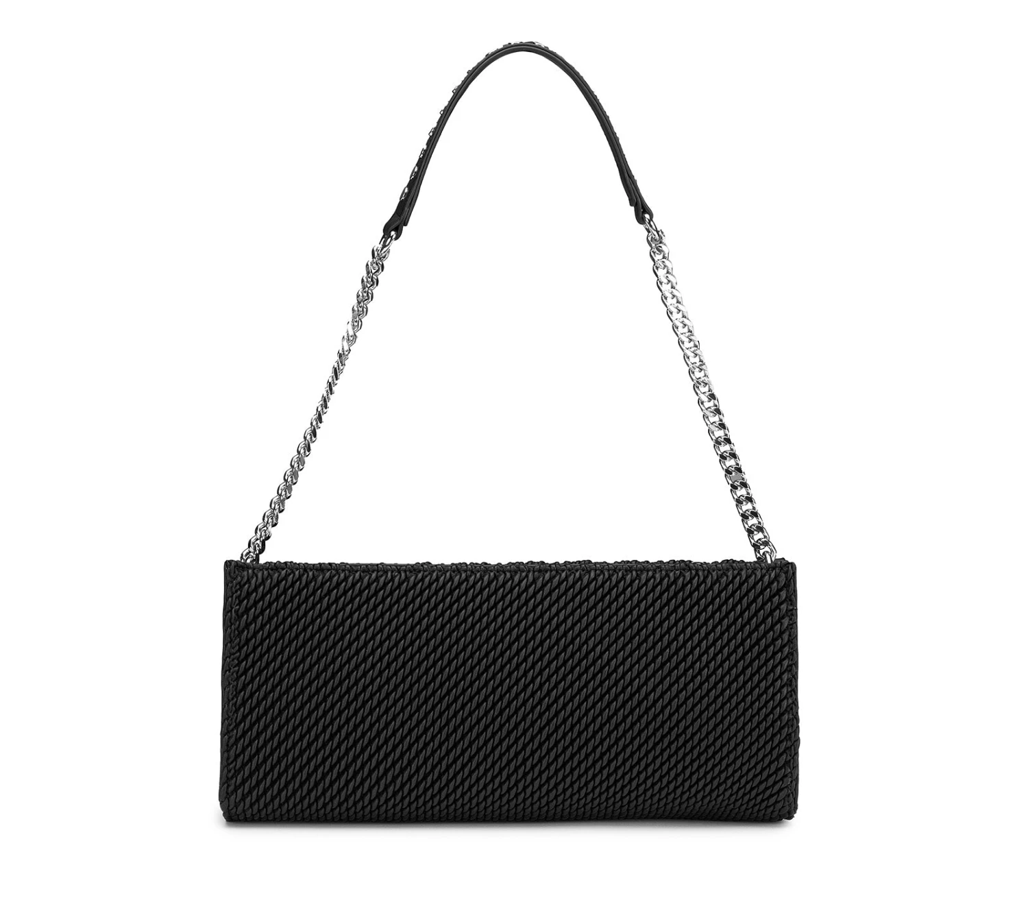 La nuova clutch SHERYL in ecopelle nera firmata CULT è l’accessorio ideale per chi ama uno stile raffinato con un tocco glam-rock. La lavorazione effetto intrecciato si unisce a dettagli metallici, come il logo lettering del brand e il manico a catena con borchie color argento, per un design ricercato e di tendenza. Perfetta per completare qualsiasi look con un tocco di carattere. Dimensioni: 30x13x6.
