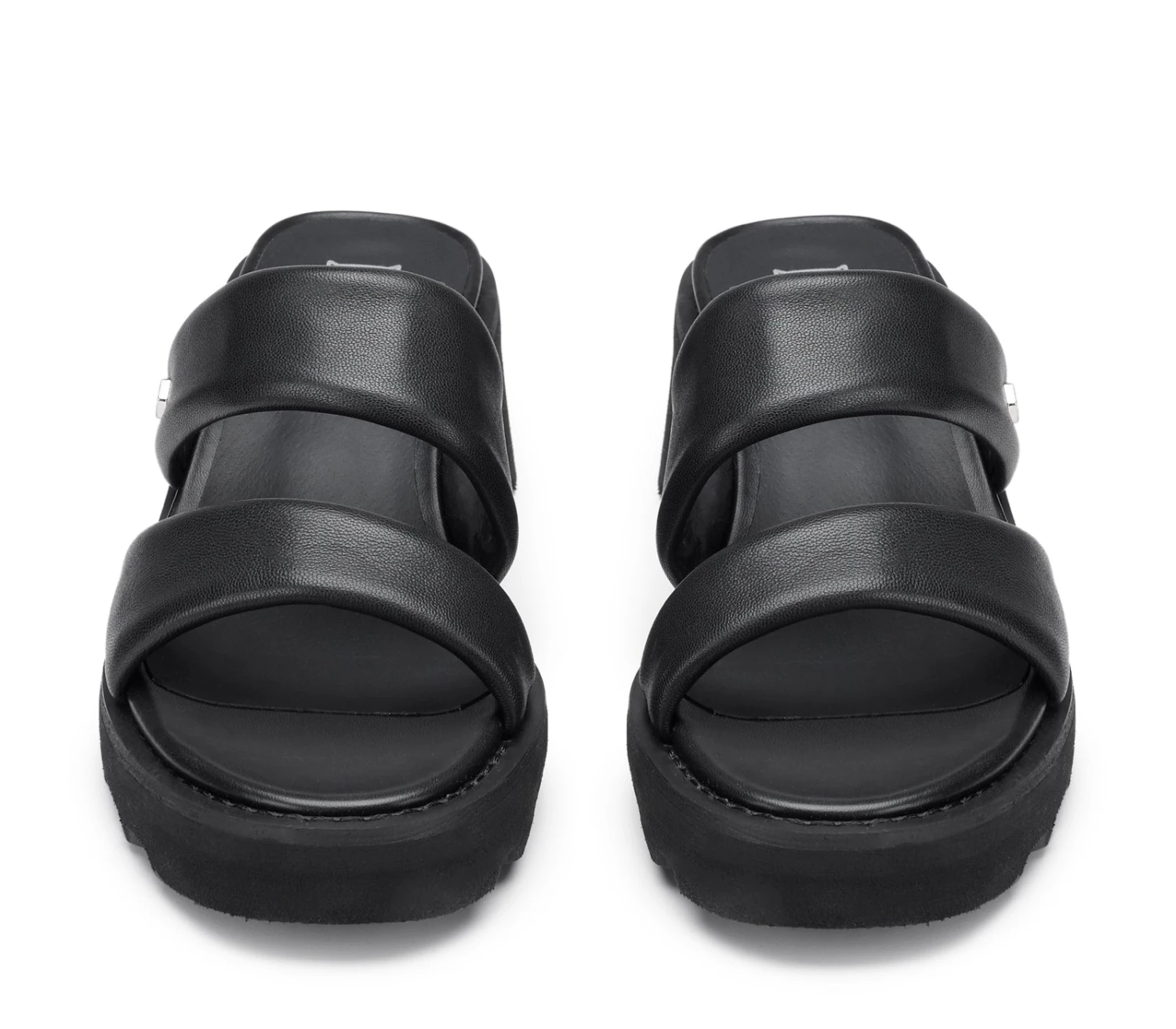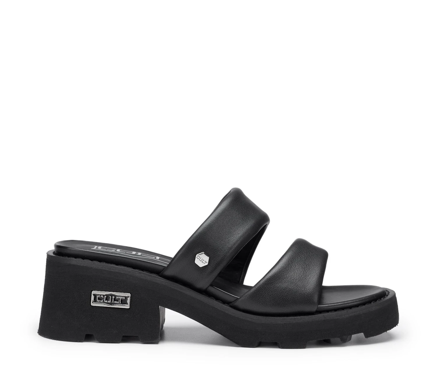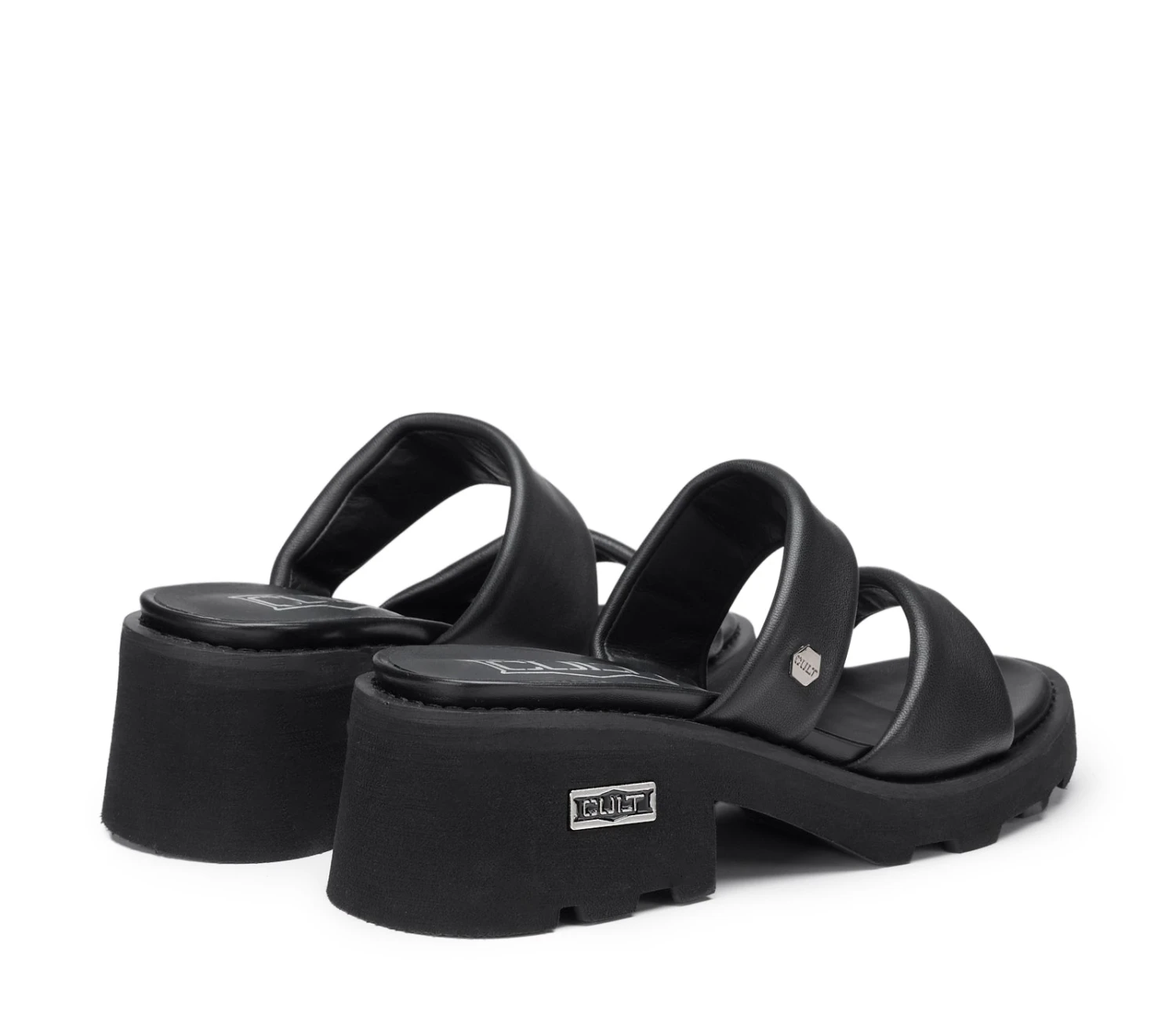 Sofisticato e audace, il sandalo GRACE di CULT avvolge il piede con fasce imbottite in pelle nera, morbide ma decise. Il bullone metallico con il nome del brand dona carattere e luminosità, mentre la suola con guardolo zip aggiunge un tocco grintoso. Il logo metallico sul tacco firma con eleganza ogni passo, in un equilibrio perfetto tra stile urbano e raffinatezza senza tempo.