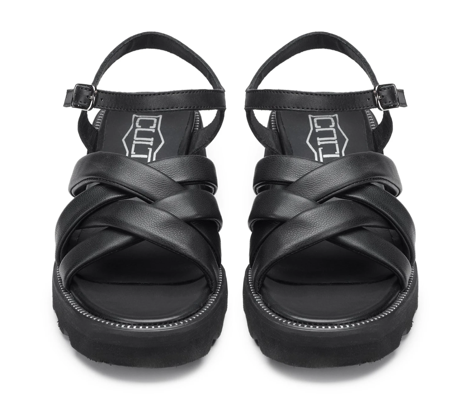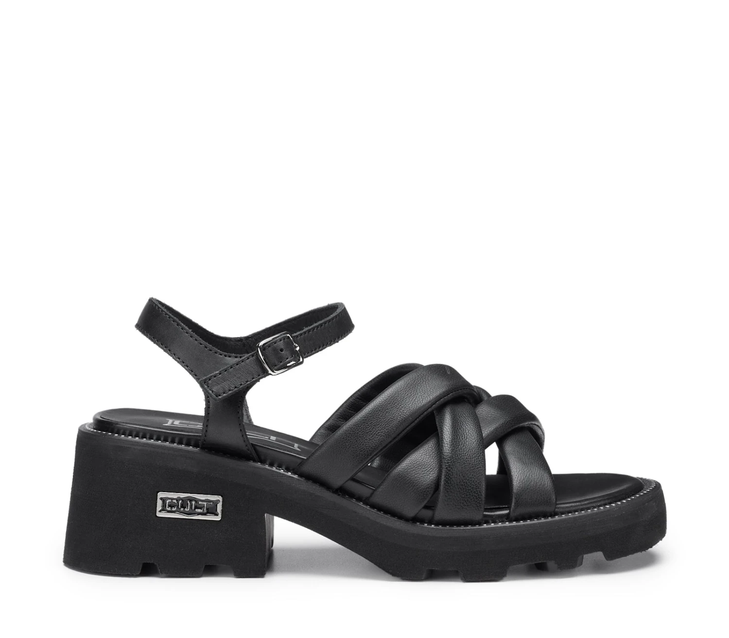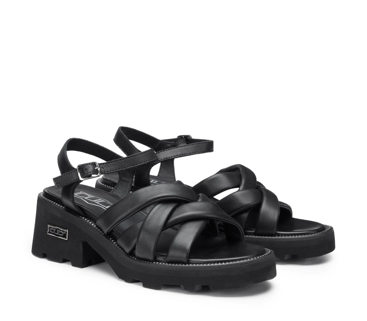 Sofisticato e audace, il sandalo GRACE di CULT avvolge il piede con fasce imbottite in pelle nera, morbide ma decise. Il cinturino posteriore, impreziosito da una fibbia metallica, dona carattere, mentre la suola con guardolo zip aggiunge un tocco grintoso. Il logo metallico sul tacco firma con eleganza ogni passo, in un equilibrio perfetto tra stile urbano e raffinatezza senza tempo.