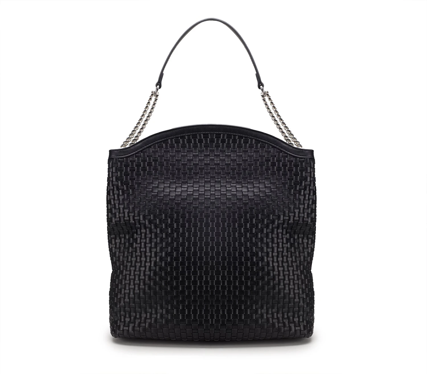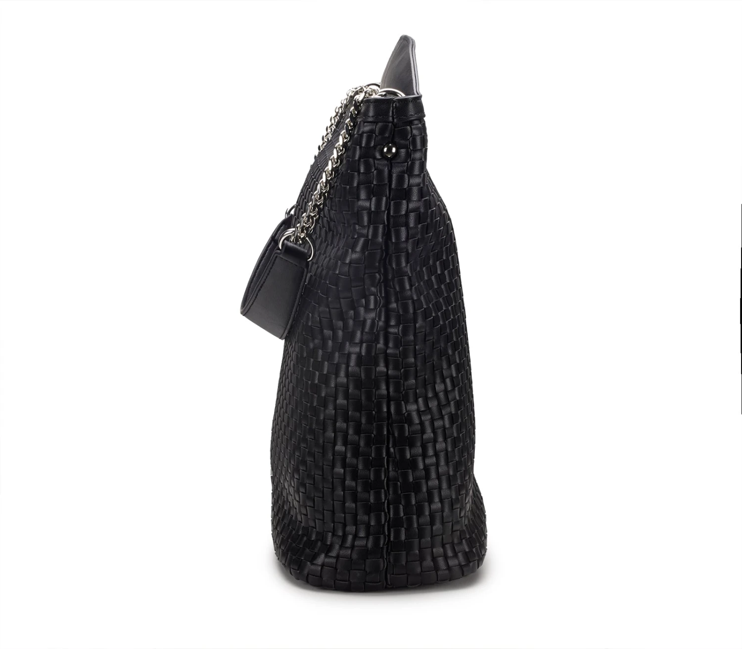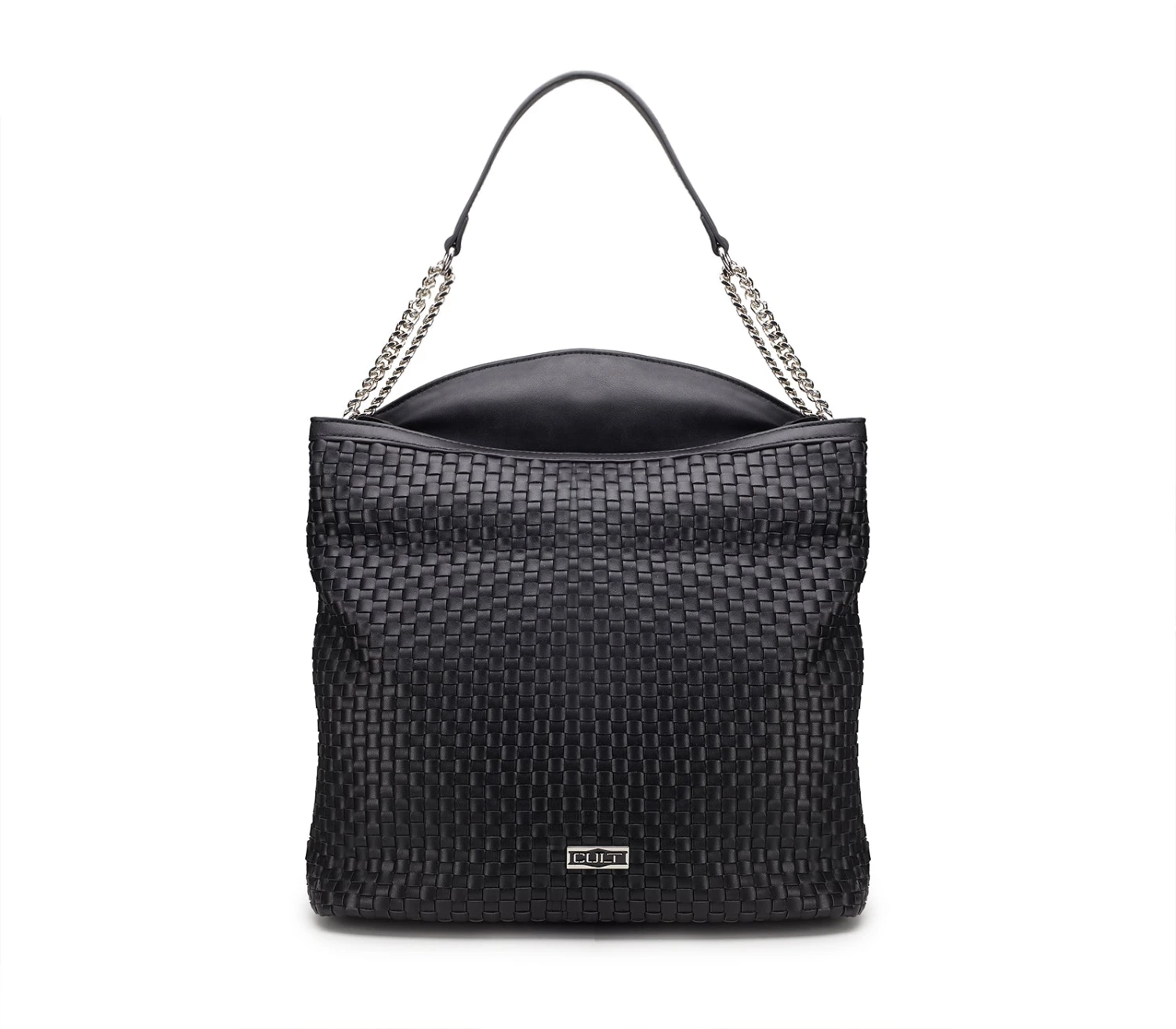 Una hobo bag che incarna l’essenza della raffinatezza contemporanea, in ecopelle nera intrecciata che avvolge con eleganza. Il manico a catena, dal fascino grintoso, si unisce al dettaglio metallico del logo, simbolo di un design audace e ricercato. Un accessorio che sa di modernità e stile, perfetto per chi cerca una borsa che parli di libertà e classe. Dimensioni: 36×32,5×14,5.