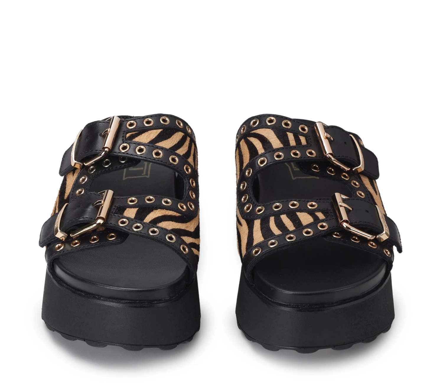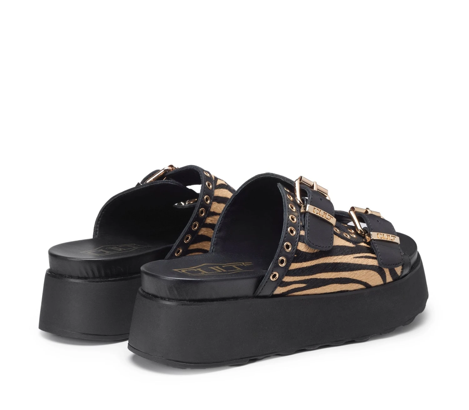 Attuali e alla moda, ma senza mai rinunciare alla propria anima rock, questo nuovo modello JANIS firmato Cult per l’estate 2025 diventerà un vero e proprio must-have. Due fasce in pelle con stampa zebrata nero/beige in pelliccia, impreziosite da fibbie in metallo dorate con logo Cult inciso, eyelet color oro e suola platform per sandali dal gusto contemporaneo che garantiscono un look decisamente glamour.