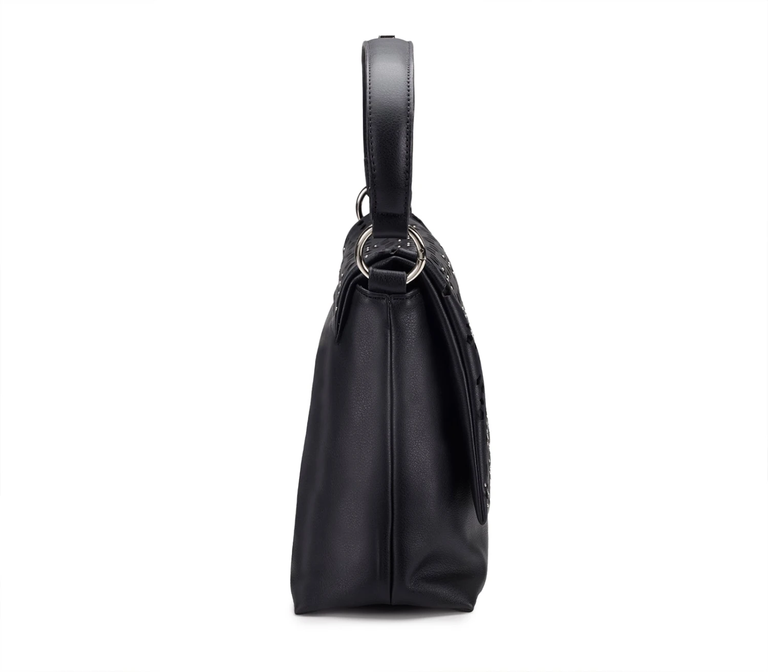 La nuova maxi flap bag NINA in ecopelle nera firmata CULT, pensata per la stagione primavera-estate 2025, unisce eleganza e carattere. Arricchita da mini borchie bubble in metallo color argento, dettagli floreali cut-out e il logo lettering del brand, questa borsa aggiunge un tocco decisamente glam-rock al tuo look. Un vero must-have per non passare inosservata. Dimensioni: 33x19x12.