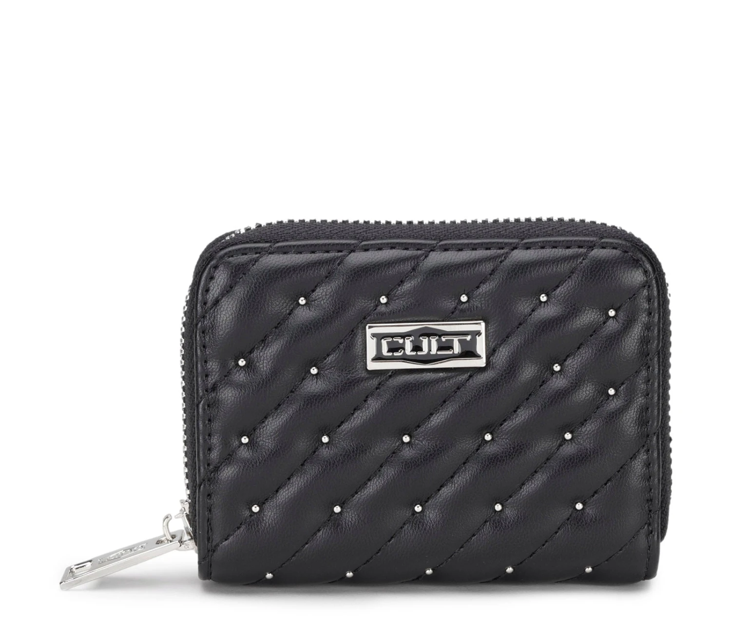 Portafoglio firmato Cult realizzato in morbida ecopelle matelassé nera è impreziosito da mini borchie e logo lettering nella parte frontale. Al suo interno sono presenti due scomparti per organizzare banconote, tessere e monete. La chiusura è tramite zip metallica. Dimensioni 10,5x8x2