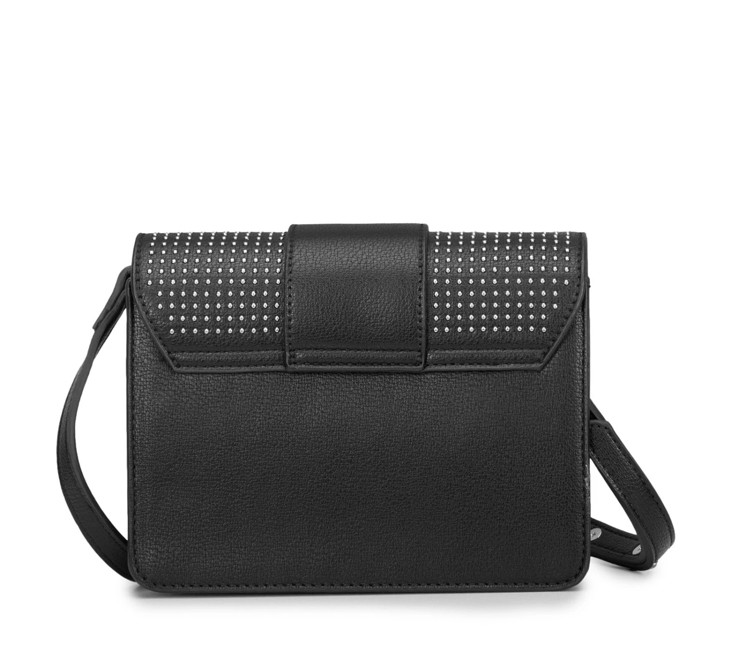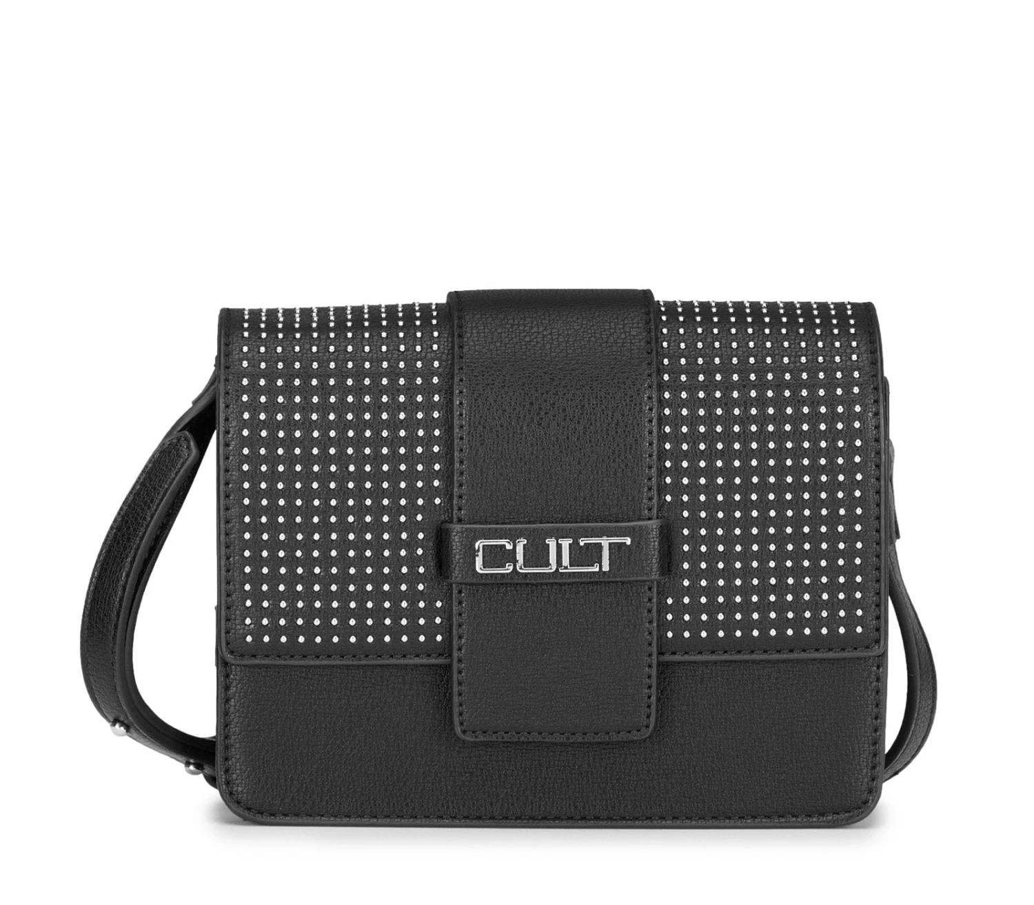 Infondete il vostro stile con la visione glam rock di Cult con questa borsa a tracolla. Realizzata in ecopelle nera, ha la caratteristica forma rettangolare e una tracolla sur ton. Si distingue per l’applicazione di micro borchie sferiche su tutta la patta. La sfoggerete a spalla o a tracolla, per godervi i pomeriggi in città a mani libere. Chiusura magnetica. Dimensioni 19x13x6