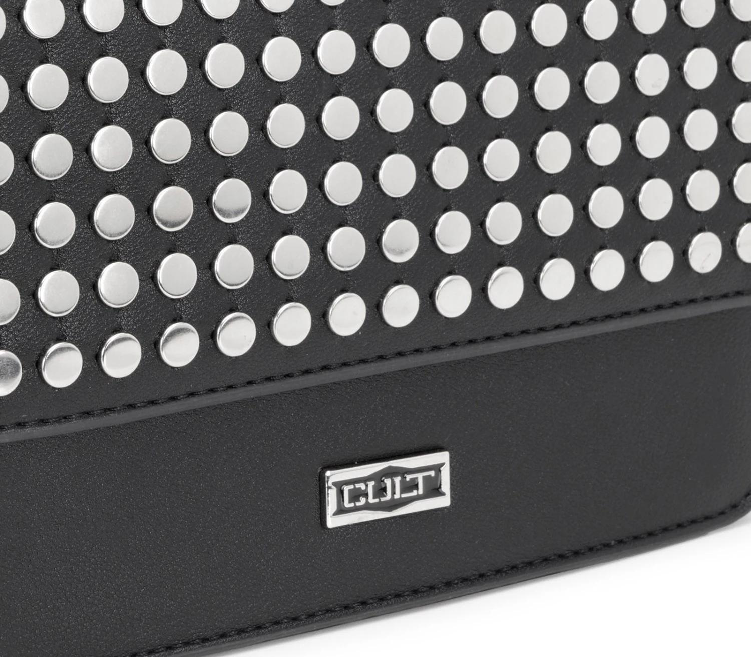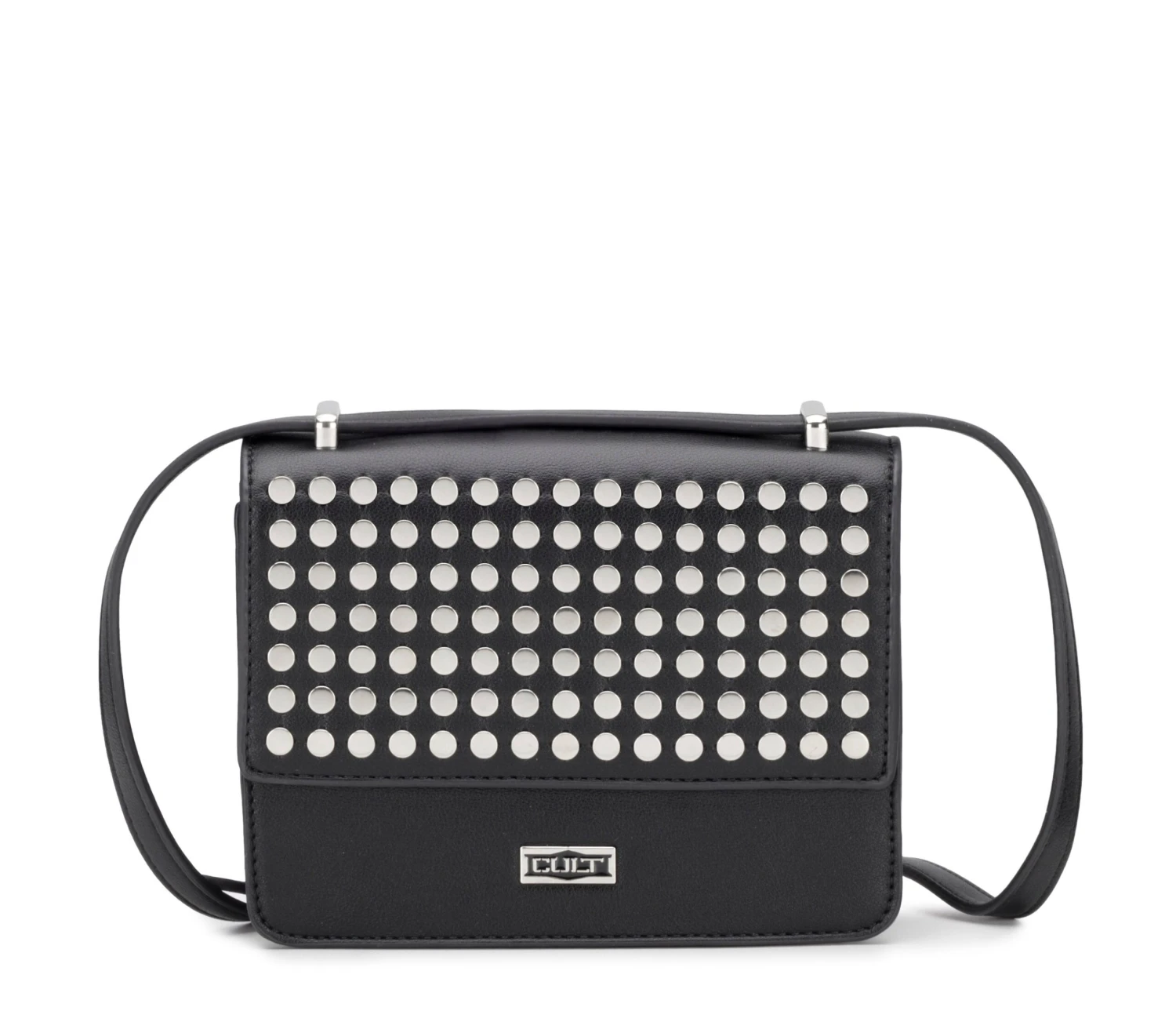 Infondete il vostro stile con la visione glam rock di Cult con questa borsa a tracolla. Realizzata in ecopelle nera, ha la caratteristica forma rettangolare e una tracolla regolabile. Si distingue per l’applicazione di borchie piatte in metallo silver su tutta la patta. La sfoggerete a spalla o a tracolla, per godervi i pomeriggi in città a mani libere. Chiusura magnetica. Dimensioni 19x13x6
