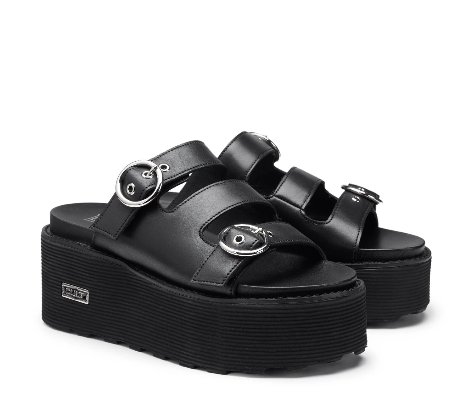 Vero must-have di questa stagione, i sandali firmati CULT poggiano su una suola platform e sono assicurati da una maxi fascia in pelle nera cut-out arricchita da fibbie a cerchio metalliche. Contemporanei e minimal, saranno un successo assicurato con shorts, maxi dress estivi e bluse colorate.