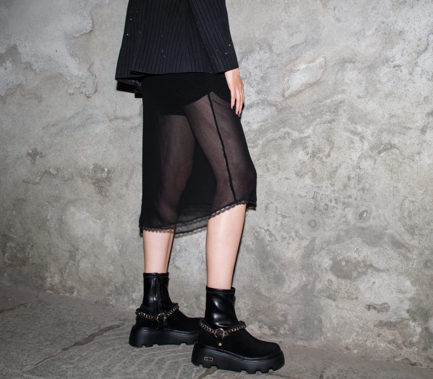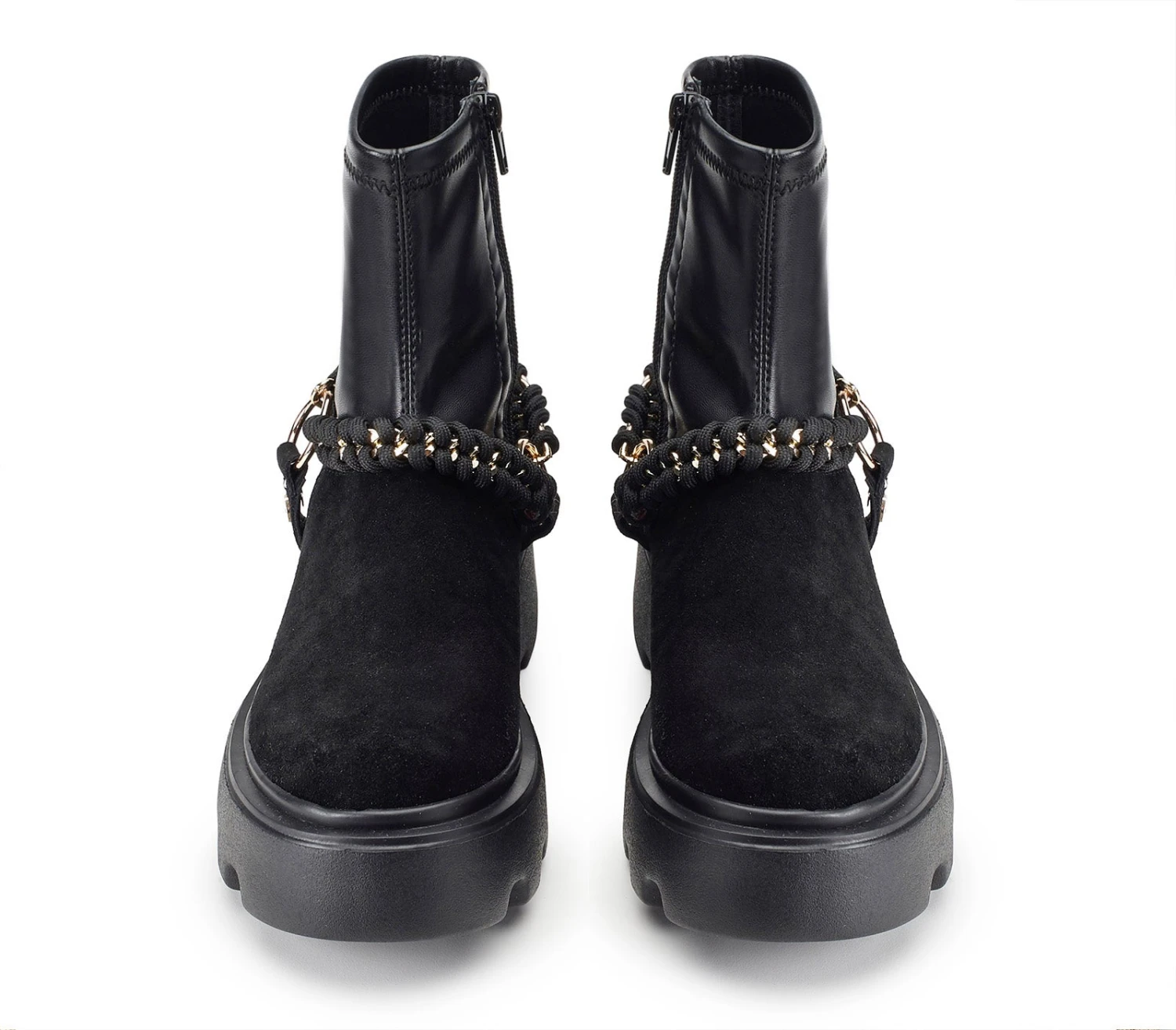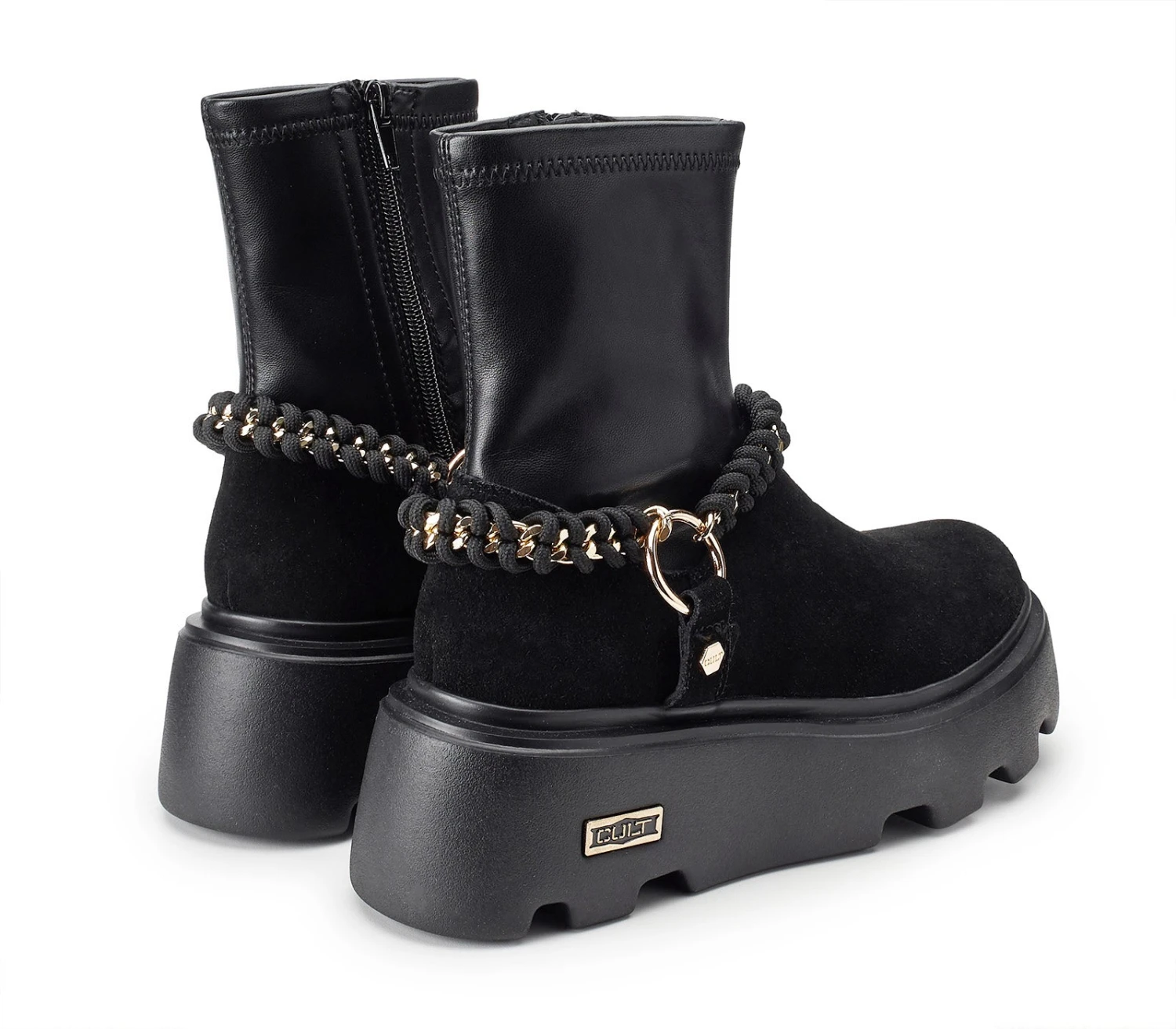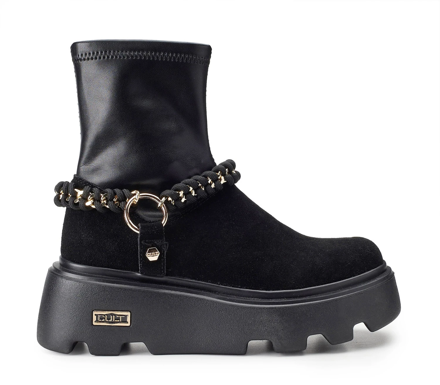 Date una marcia in più ai vostri outfit indossando questi stivaletti firmati Cult. Il design di tendenza in pelle scamosciata con il gambale vegan stretch, presenta la suola platform scanalata ed è arricchito da nuovo accessorio scoobidoo catena: un’accattivante lavorazione ad intreccio su catena metallica diamantata.