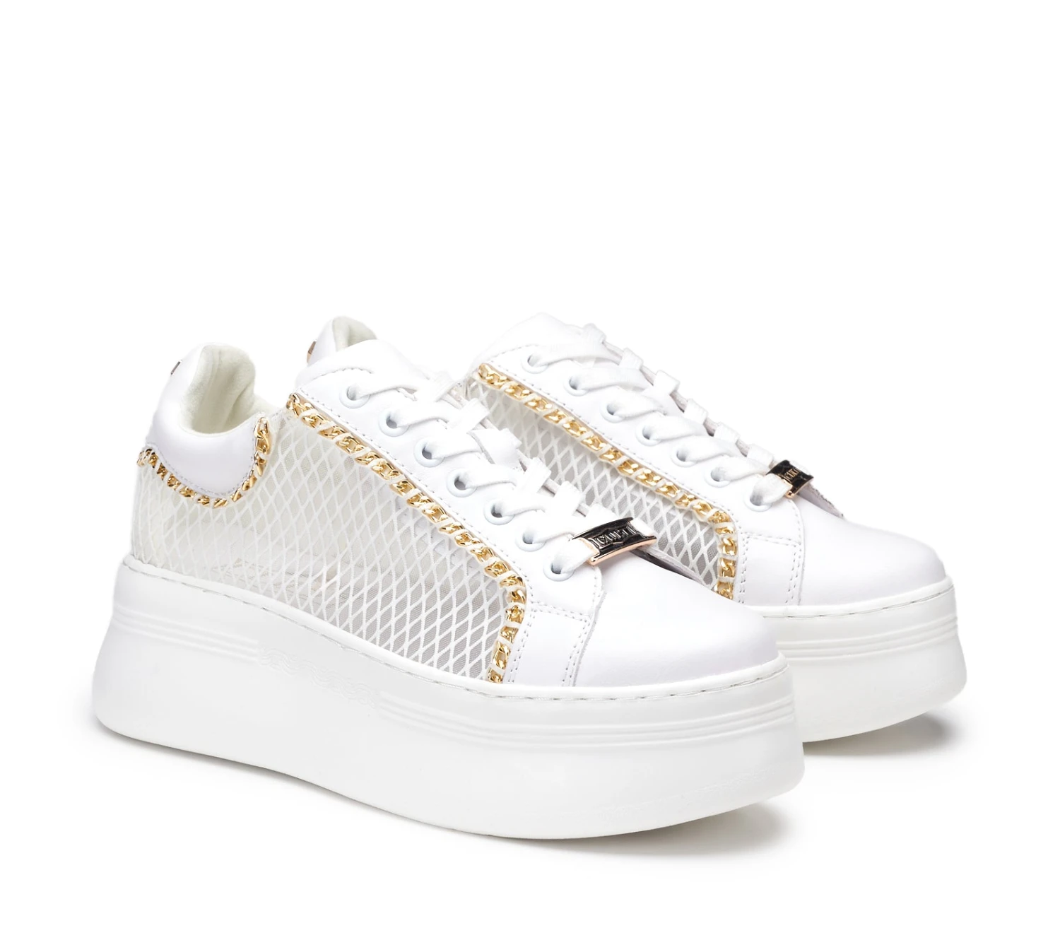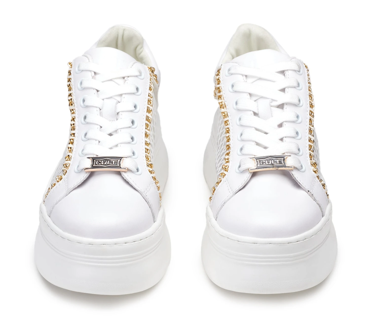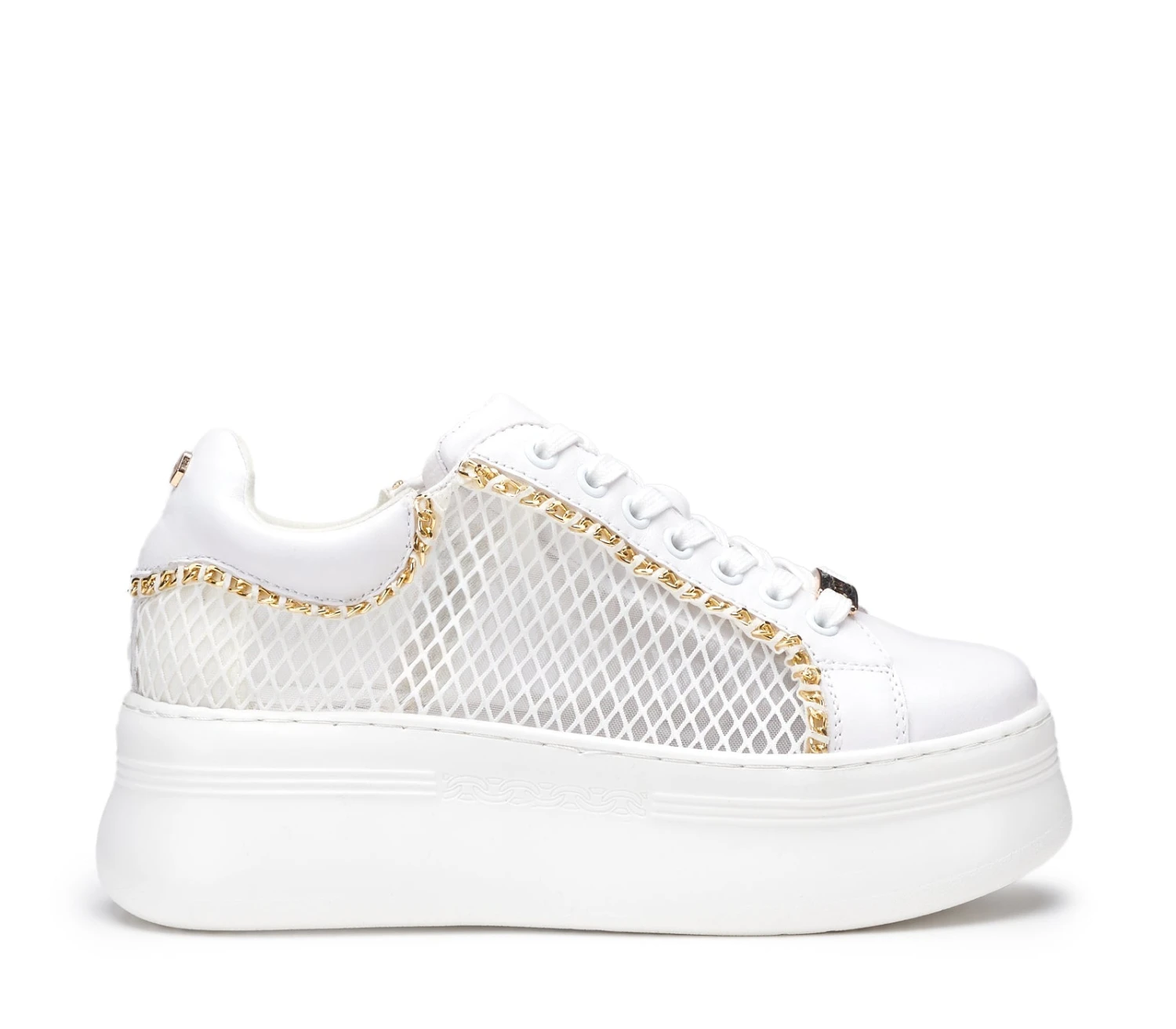 Total white per queste nuove sneakers PEARL in pelle firmate CULT. Lacci sur ton, dettagli caratterizzati da sottili catene metalliche color oro e da una tomaia in un mix di pelle e rete mesh che le rende grintose e femminili allo stesso tempo, per un effetto davvero glam-rock. La loro silhouette offre infinite possibilità di abbinamento.