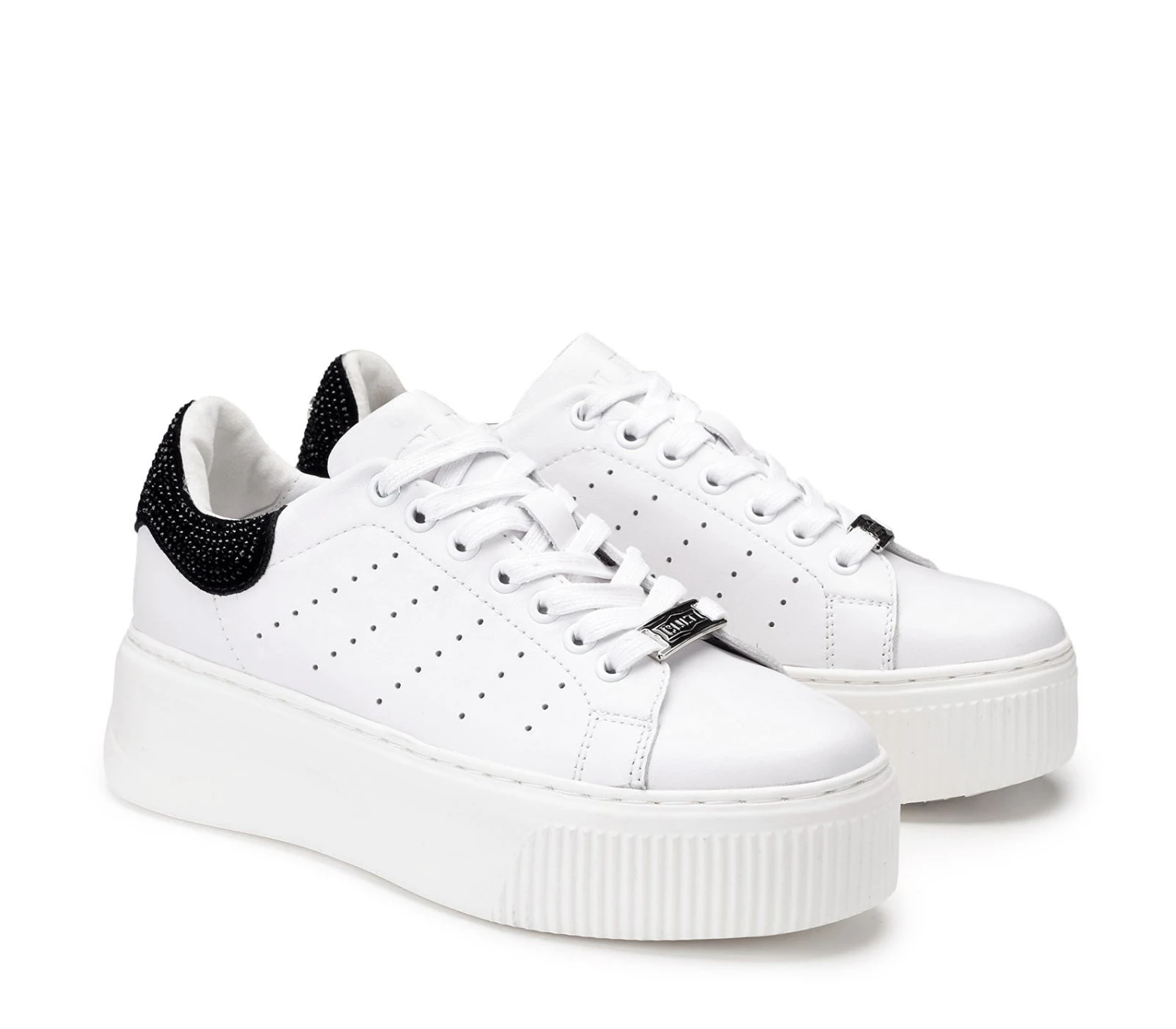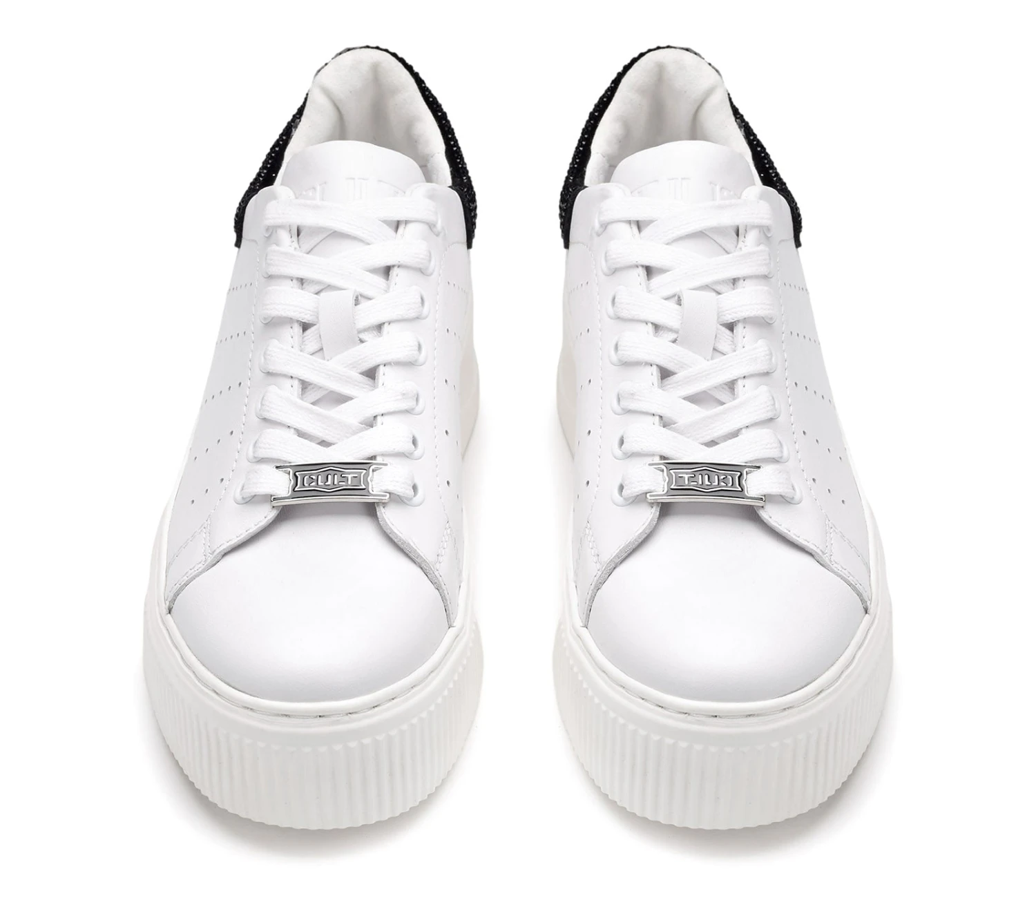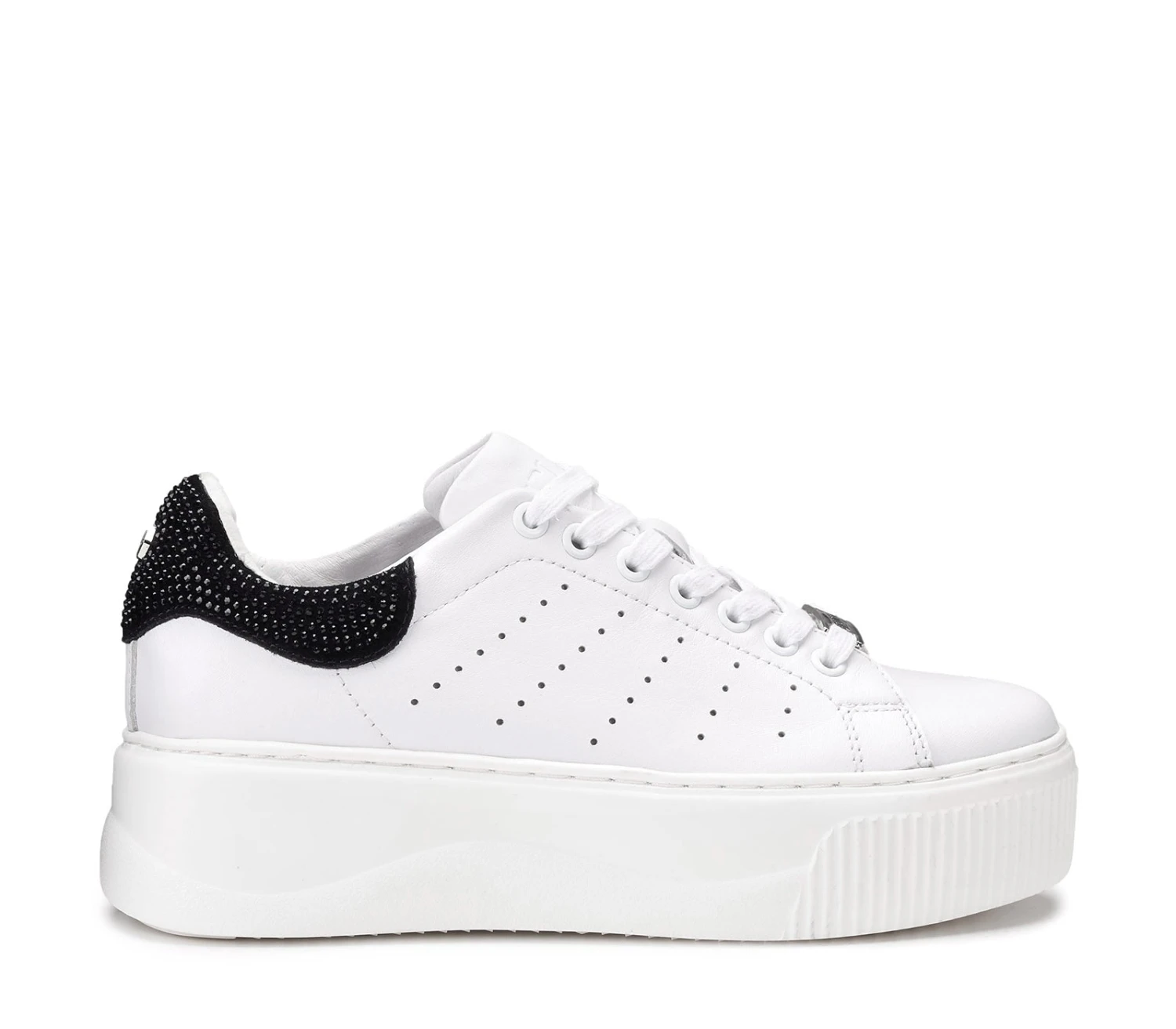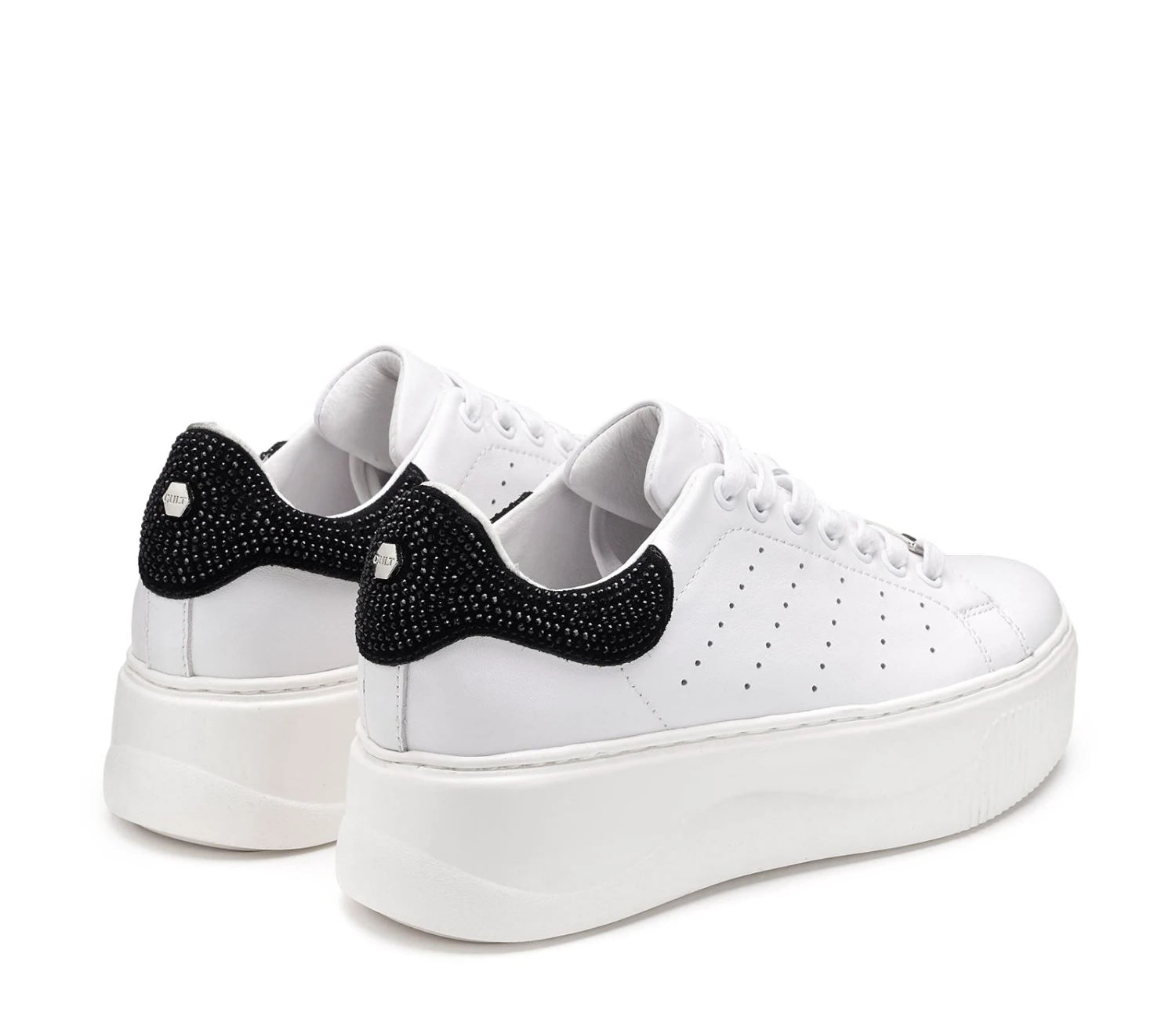 Black & white per le sneakers in pelle firmate CULT per questa stagione. Lacci sur ton e contrafforte a contrasto impreziosito da strass neri sul retro della scarpa per un effetto davvero glamour. Da indossare sotto un vestito slim e blazer per un mix moderno e d’effetto. Altezza suola 5,3cm