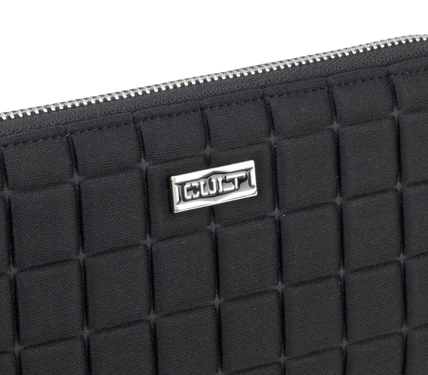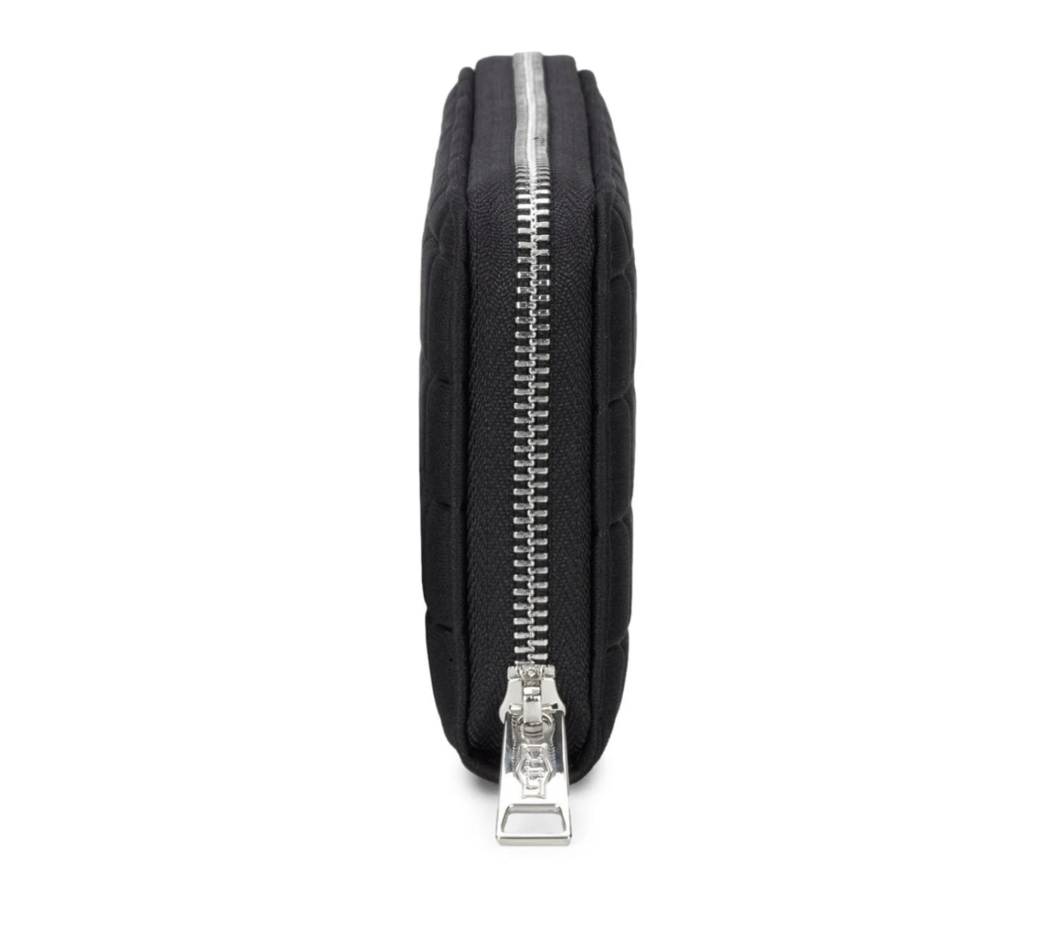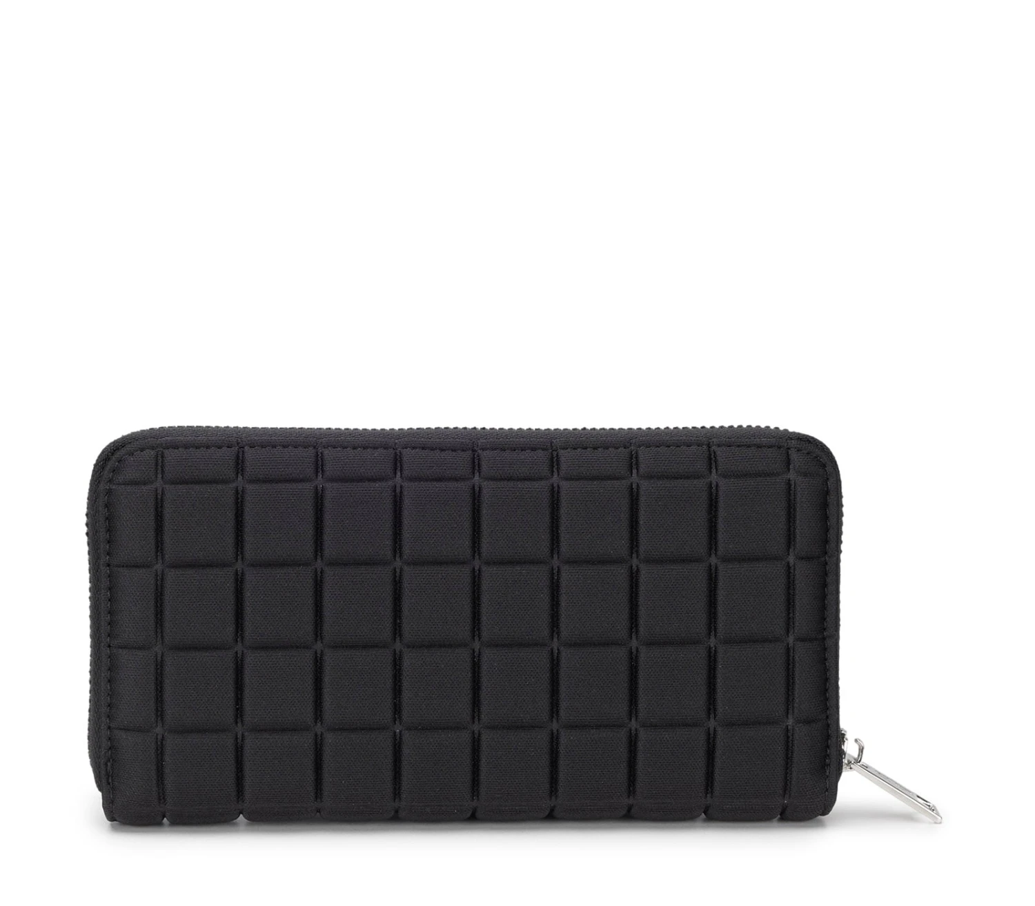 Portafoglio firmato Cult realizzato in tessuto imbottito e logo lettering nella parte frontale. Al suo interno sono presenti due scomparti per organizzare banconote, tessere e monete. La chiusura è tramite zip metallica. Dimensioni 19.5x10x2,5
