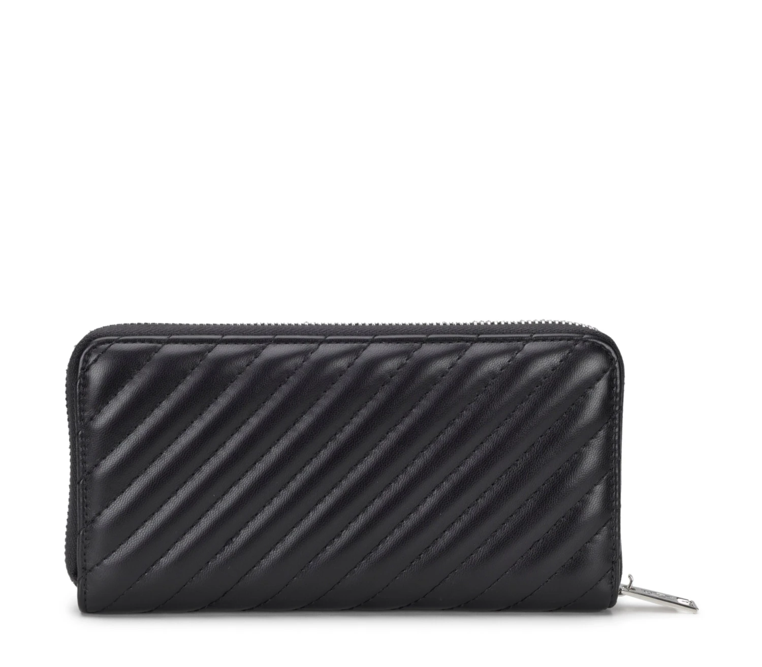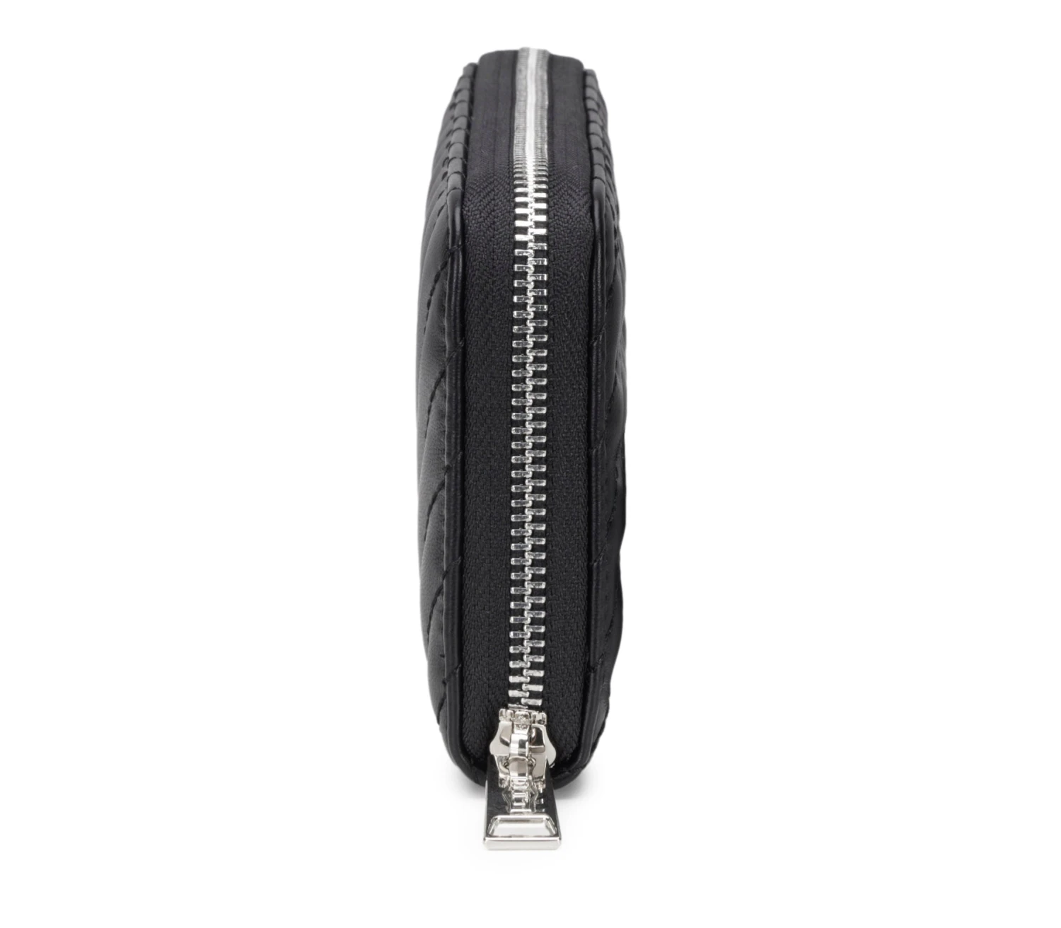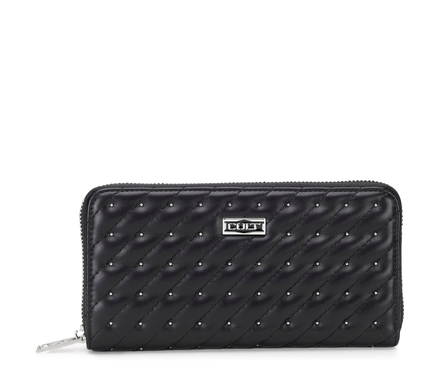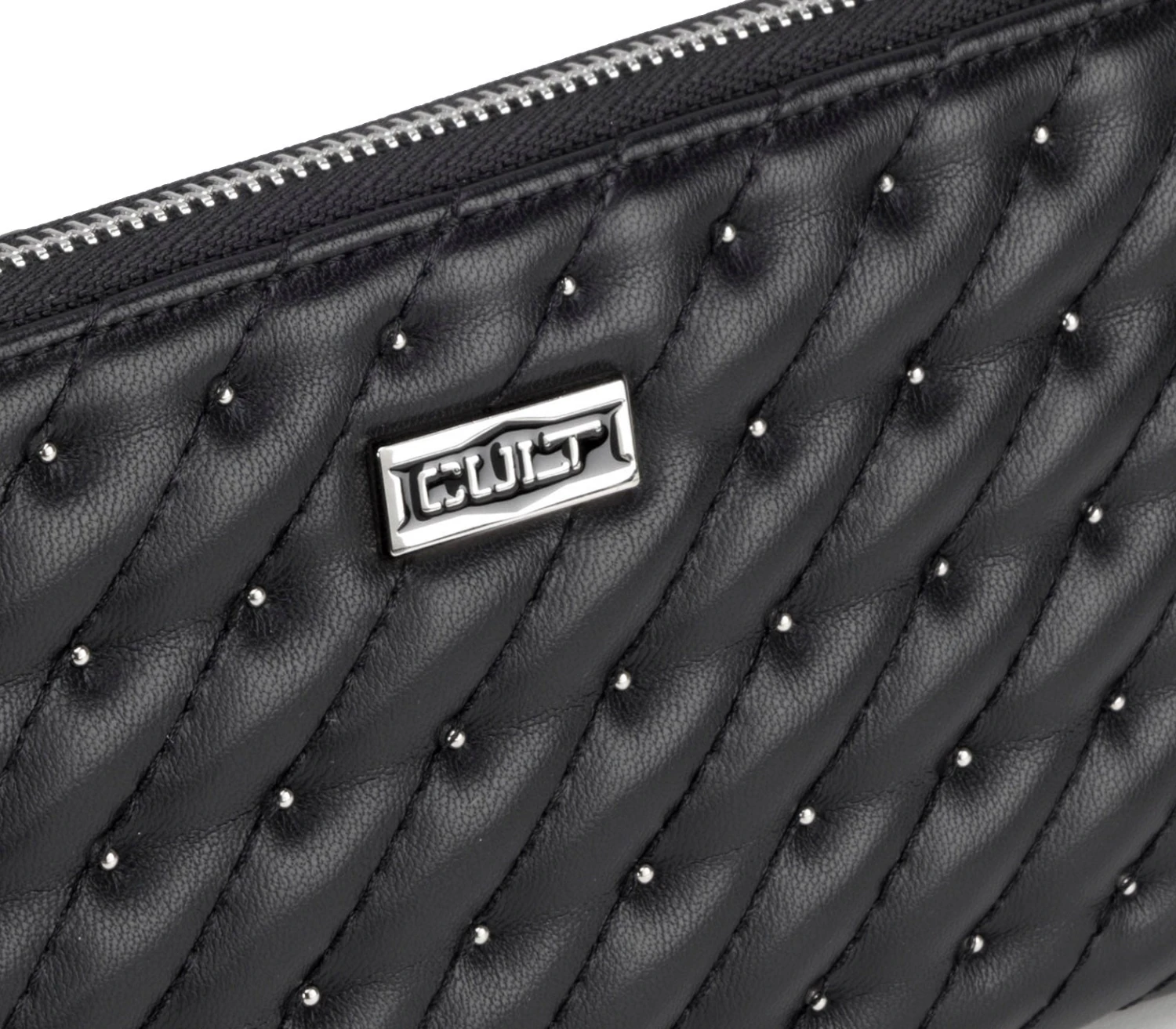 Portafoglio firmato Cult realizzato in morbida ecopelle matelassé nera è impreziosito da mini borchie e logo lettering nella parte frontale. Al suo interno sono presenti due scomparti per organizzare banconote, tessere e monete. La chiusura è tramite zip metallica. Dimensioni 19,5x10x2,5