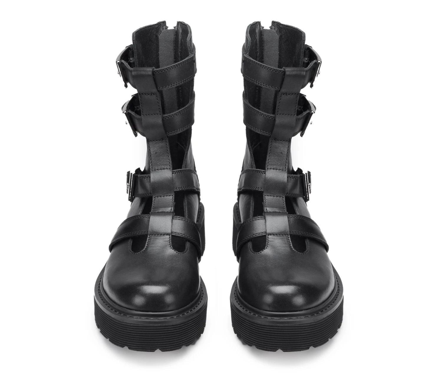 Questi nuovi anfibi estivi realizzati da Cult per la stagione primavera/estate sono un perfetto mix di stile glamrock e contemporaneo. Realizzati in pelle nera, presentano una struttura originale grazie all’iconica suola carrarmato Slash, spessa e resistente. Il design è caratterizzato da dettagli cut-out e cinturini multipli con fibbie in metallo argentato, che conferiscono un tocco grintoso e deciso. L’estetica audace e moderna li rende ideali per chi ama distinguersi con un look ribelle e di carattere.