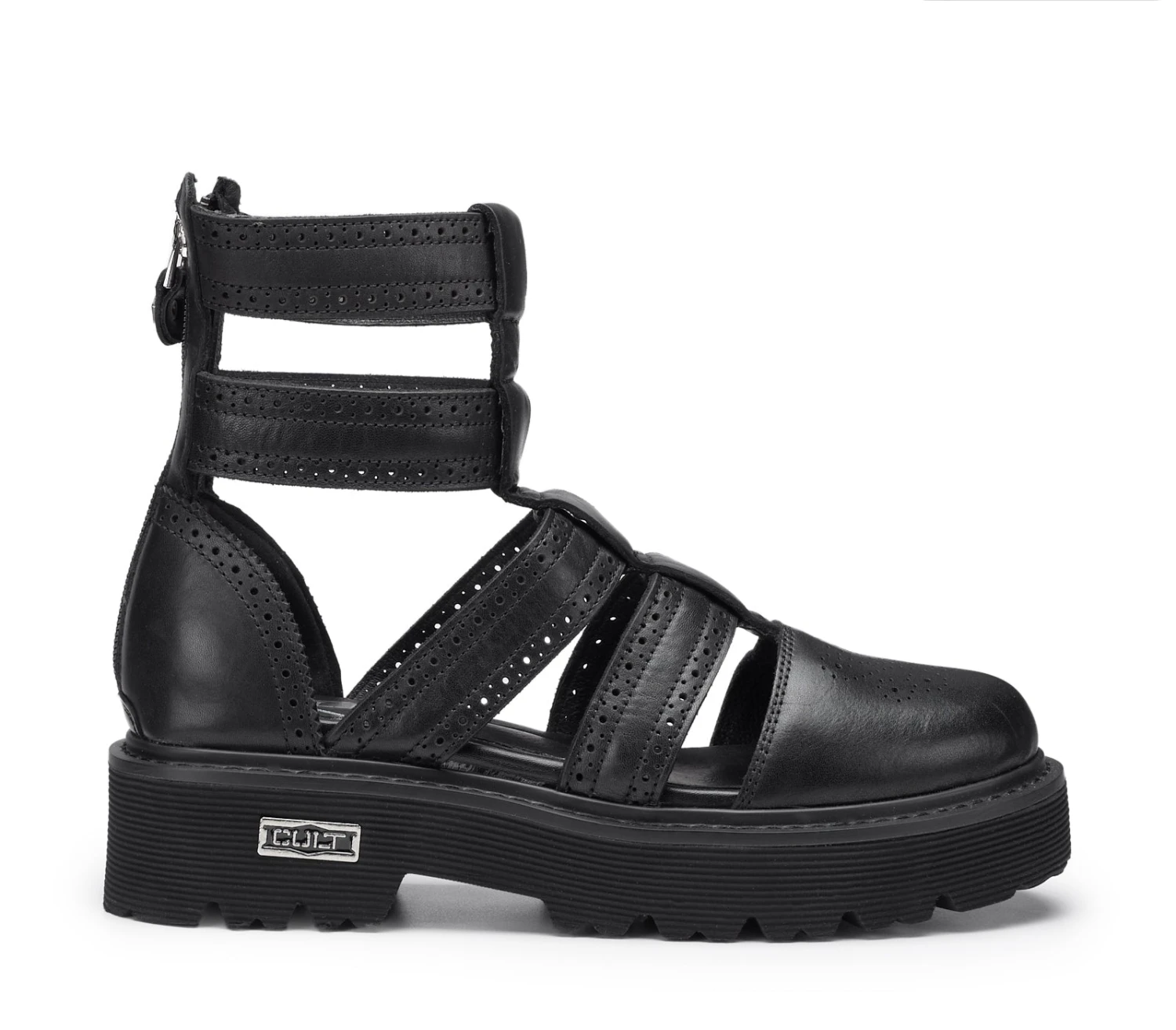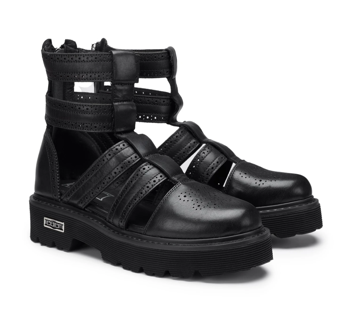 Questi nuovi anfibi estivi realizzati da Cult per la stagione primavera/estate sono un perfetto mix di stile glamrock e contemporaneo. Realizzati in pelle nera con forature delicate, presentano una struttura originale e l’iconica suola carrarmato Slash, spessa e resistente. Il design è caratterizzato da dettagli cut-out e fasce multiple con chiusura tramite zip posteriore, che conferiscono un tocco grintoso e deciso. L’estetica audace e moderna li rende ideali per chi ama distinguersi con un look ribelle e di carattere.
