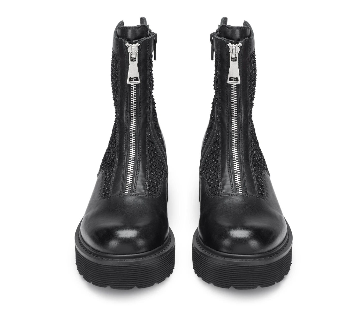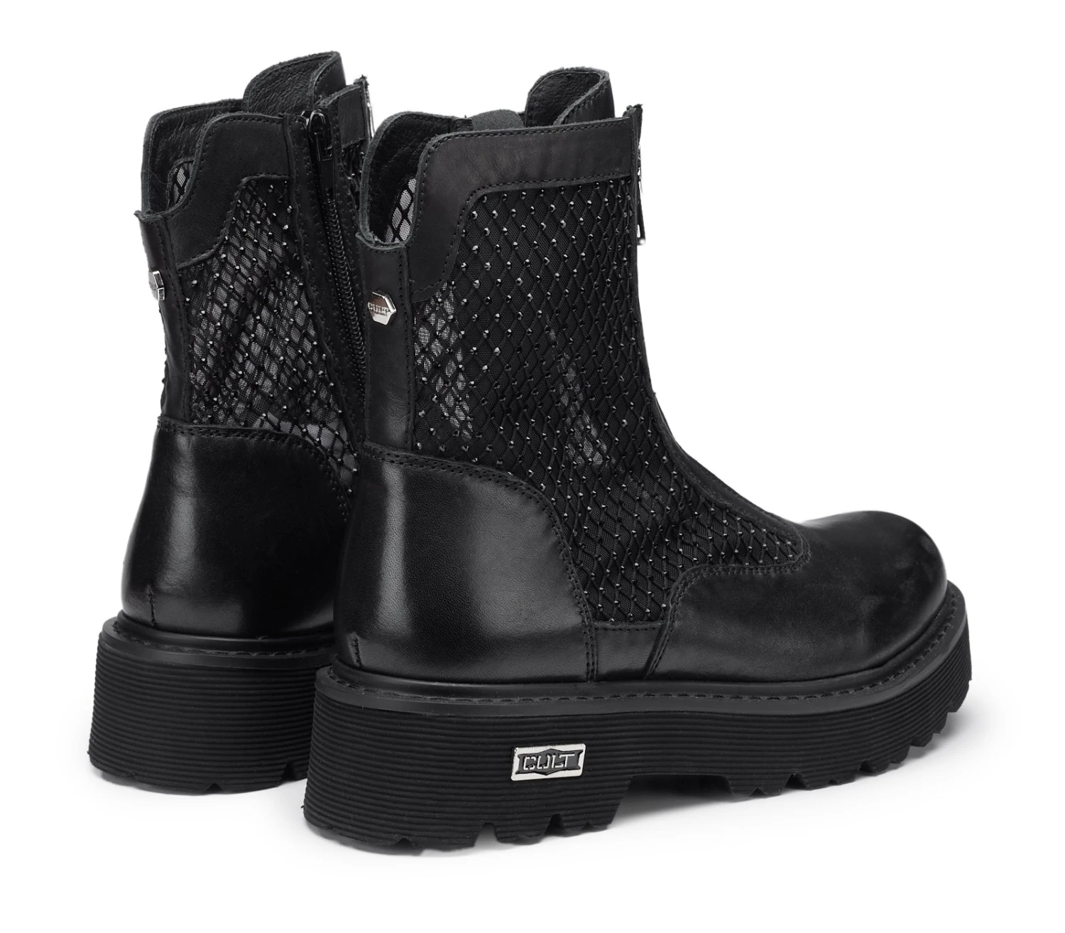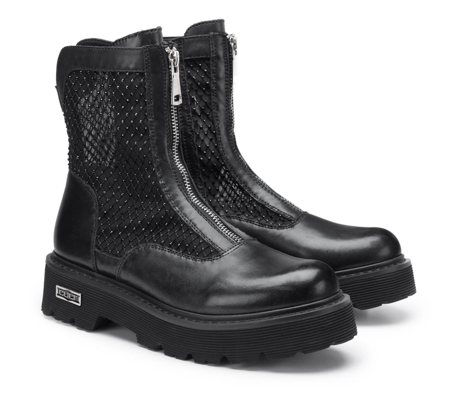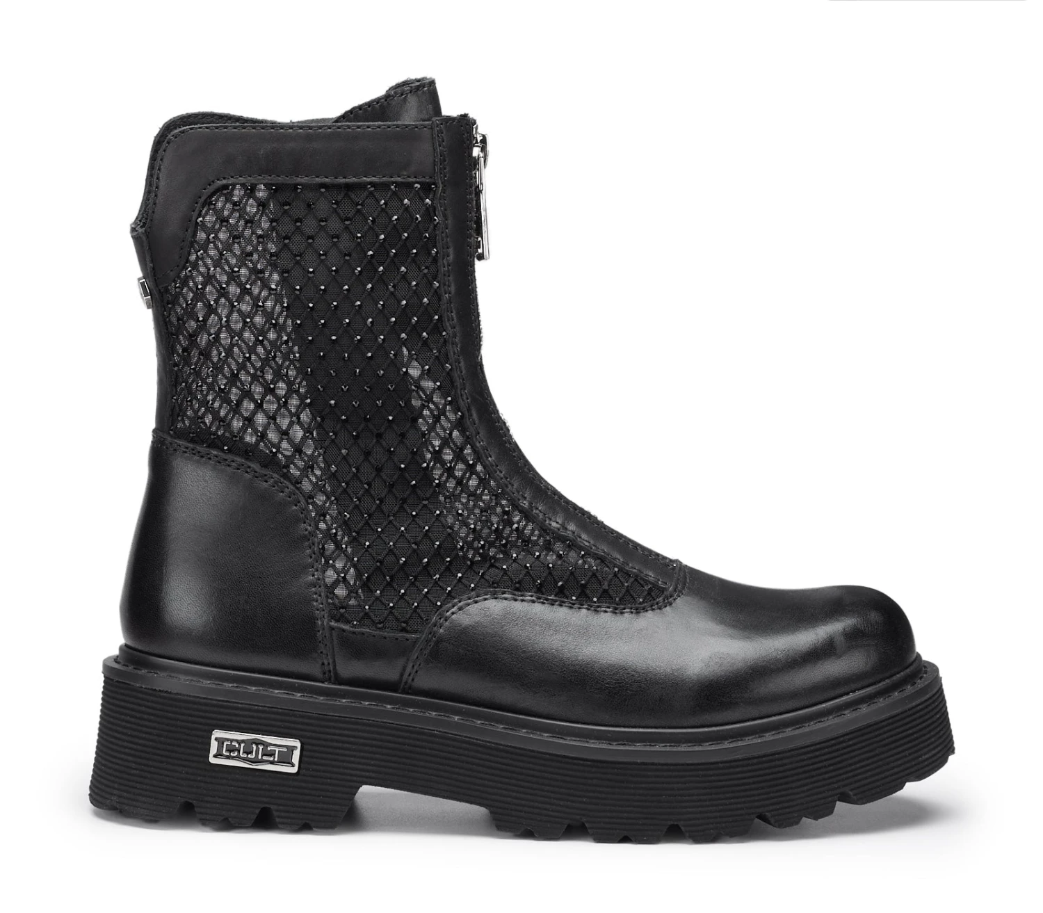 Originali ma dalla fortissima anima rock questi anfibi in pelle nera firmati Cult per questa primavera estate. La rete strass del gambale sfoderato li rende una scarpa gioiello adatta anche alle grandi occasioni, conferendo un tocco di originalità ai vostri outfit. Chiusura tramite zip frontale.