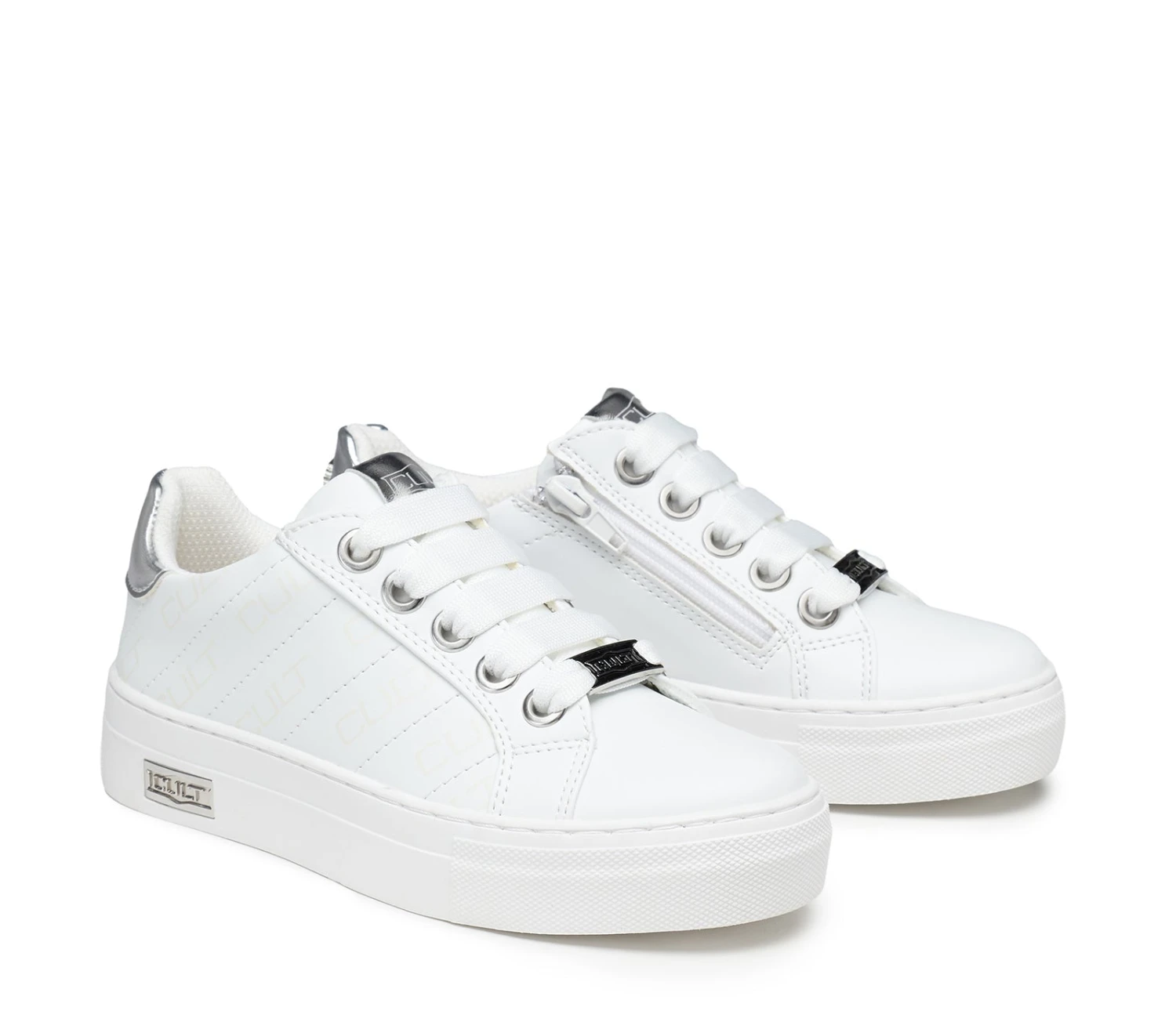 Le sneakers CULT Kids in tonalità beige con monogramma sono la scelta perfetta per chi ama un tocco raffinato e originale. Il motivo logato e le finiture dorate le rendono ideali per outfit eleganti ma anche casual.