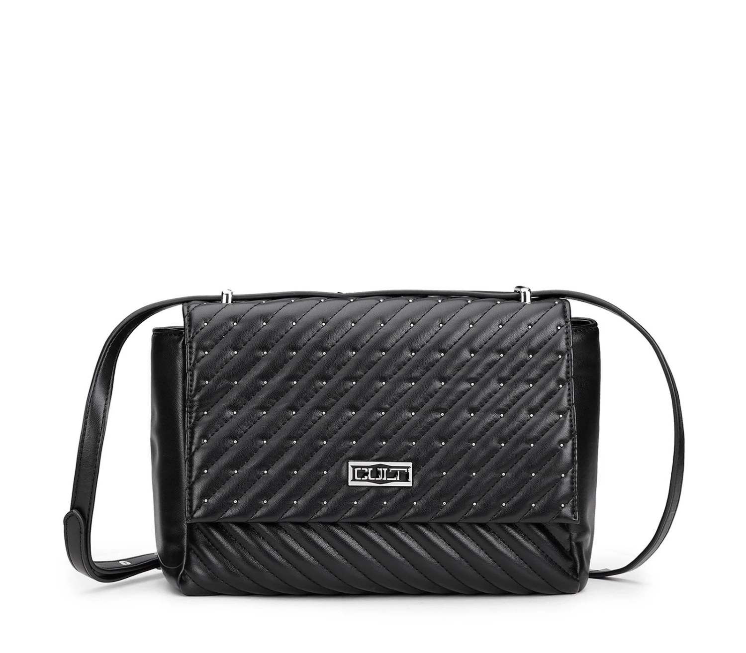 La borsa a tracolla di Cult è una compagna sofisticata di giorno e di sera. Modello dalla silhouette morbida in ecopelle nera matelassé impreziosita da micro borchie sferiche sulla patta è dotato di una tracolla regolabile. Grazie al suo stile intramontabile e all’iconico logo Cult in metallo, eleverà qualsiasi look con eleganza impareggiabile. Dimensioni 24x17x7, chiusura magnetica