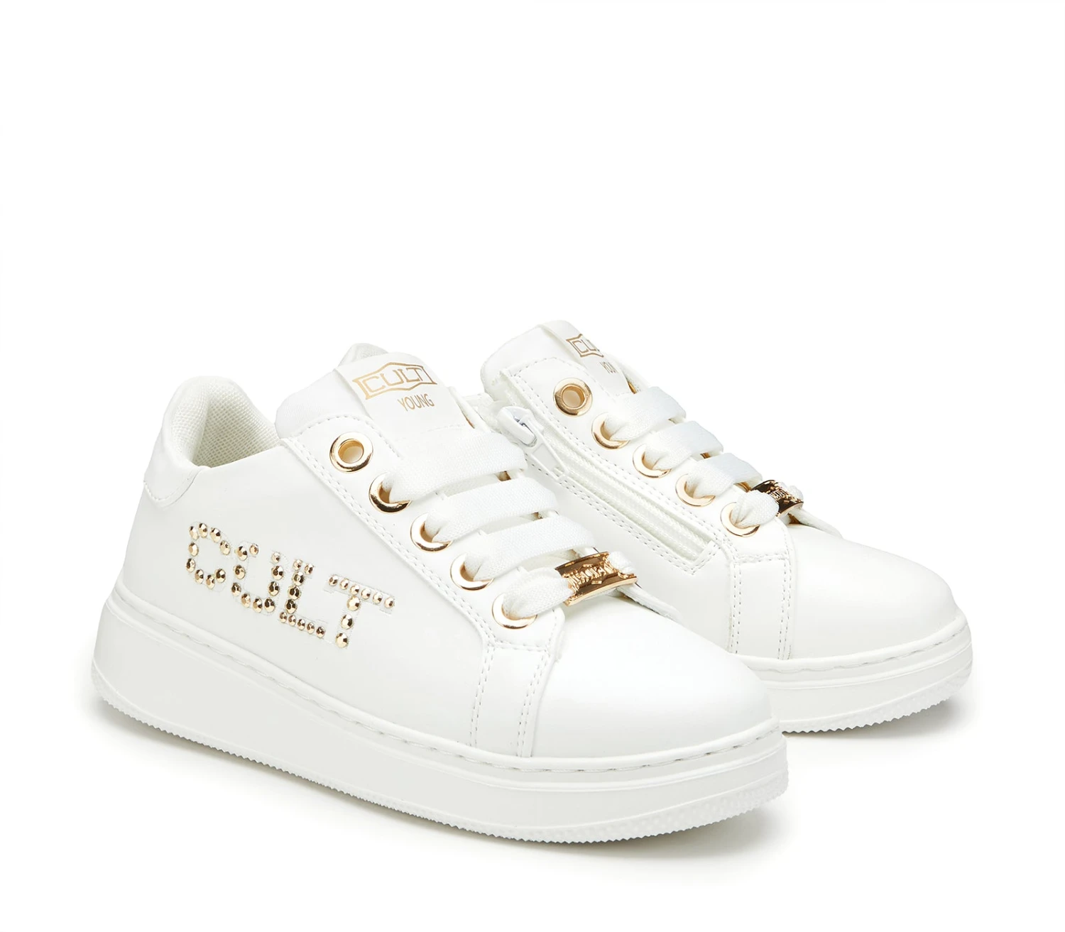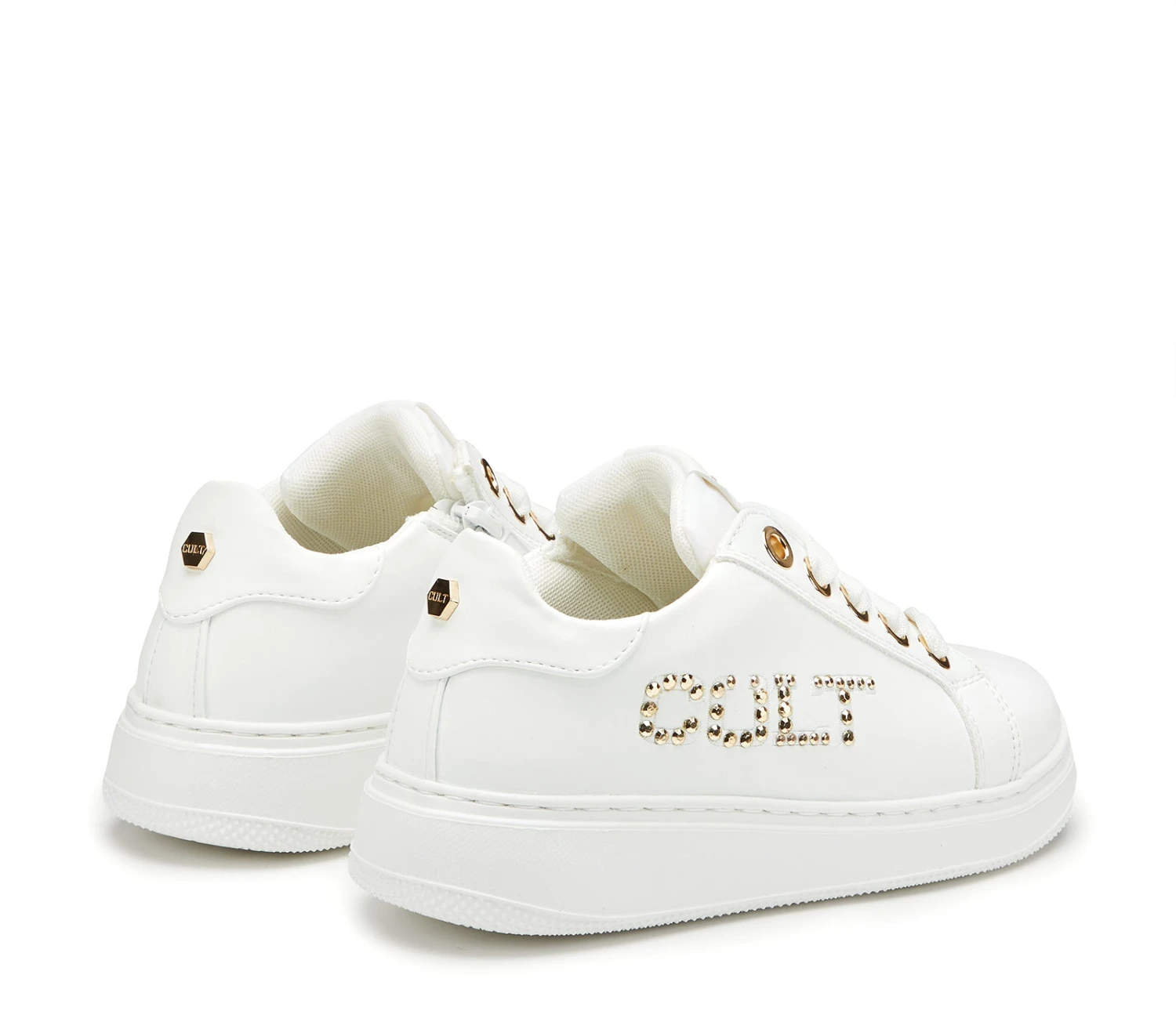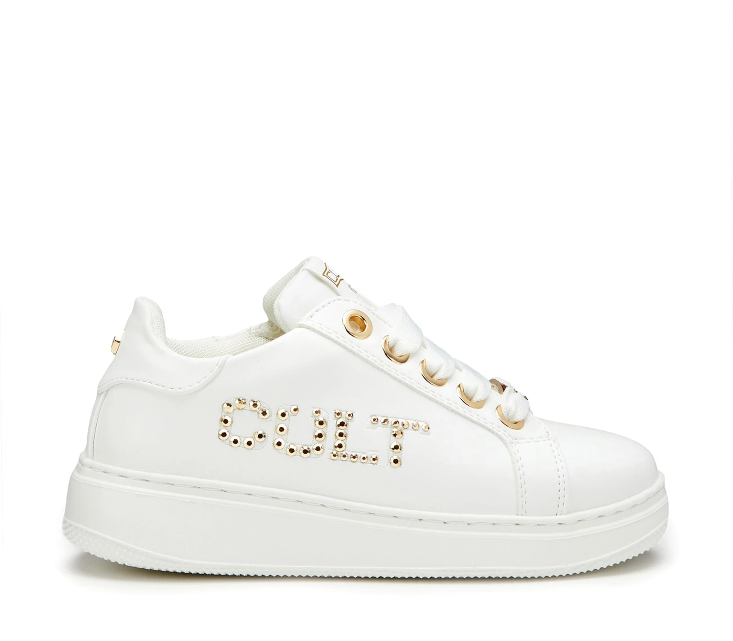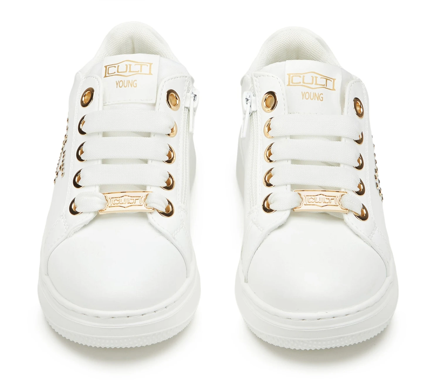 Le sneakers in ecopelle della collezione Cult Kids sono ideali per il guardaroba quotidiano della vostra piccola. Progettate con lacci, presentano un giocoso logo realizazato con le micro borchie in metallo oro sul lato esterno della scarpa.
