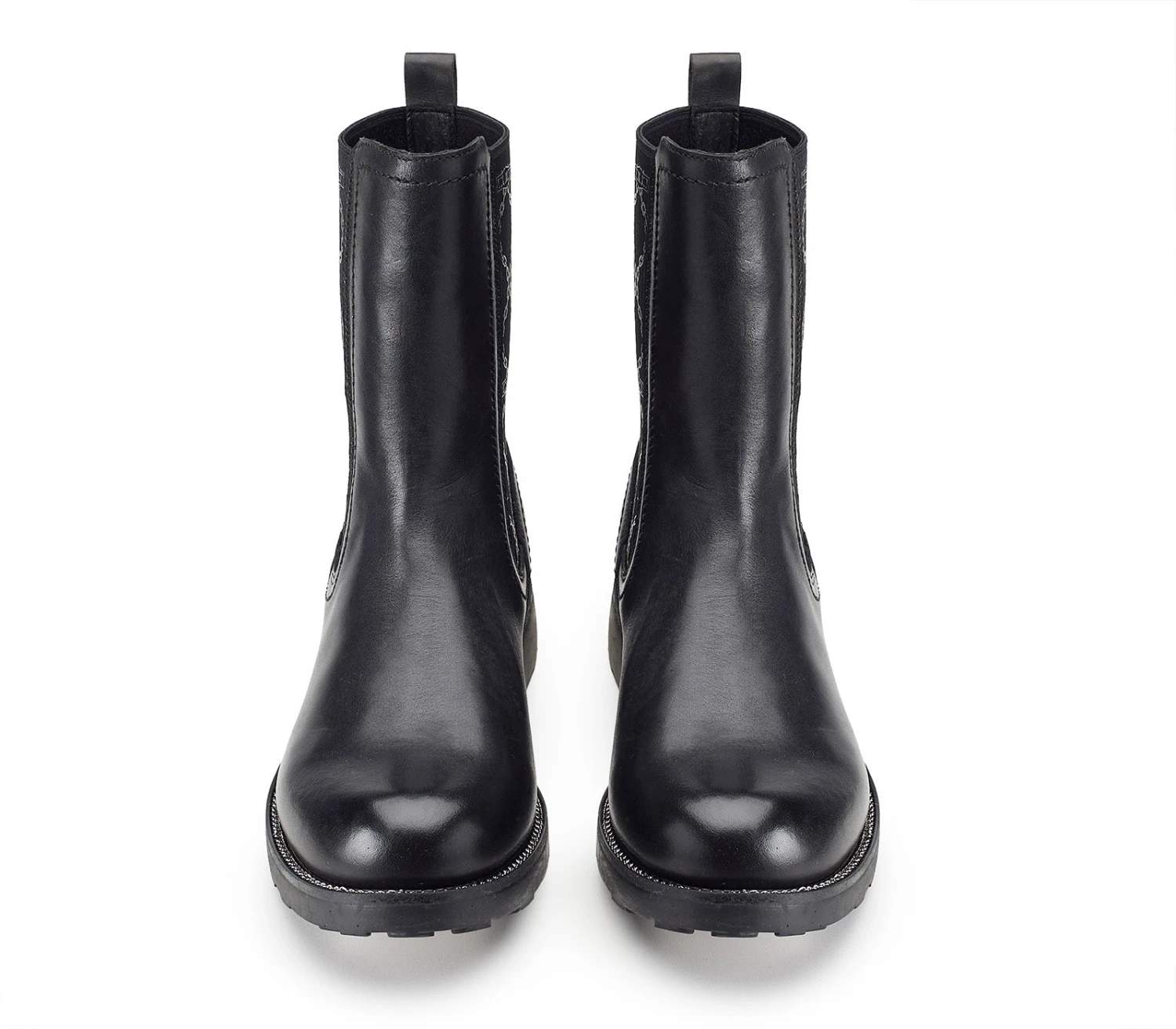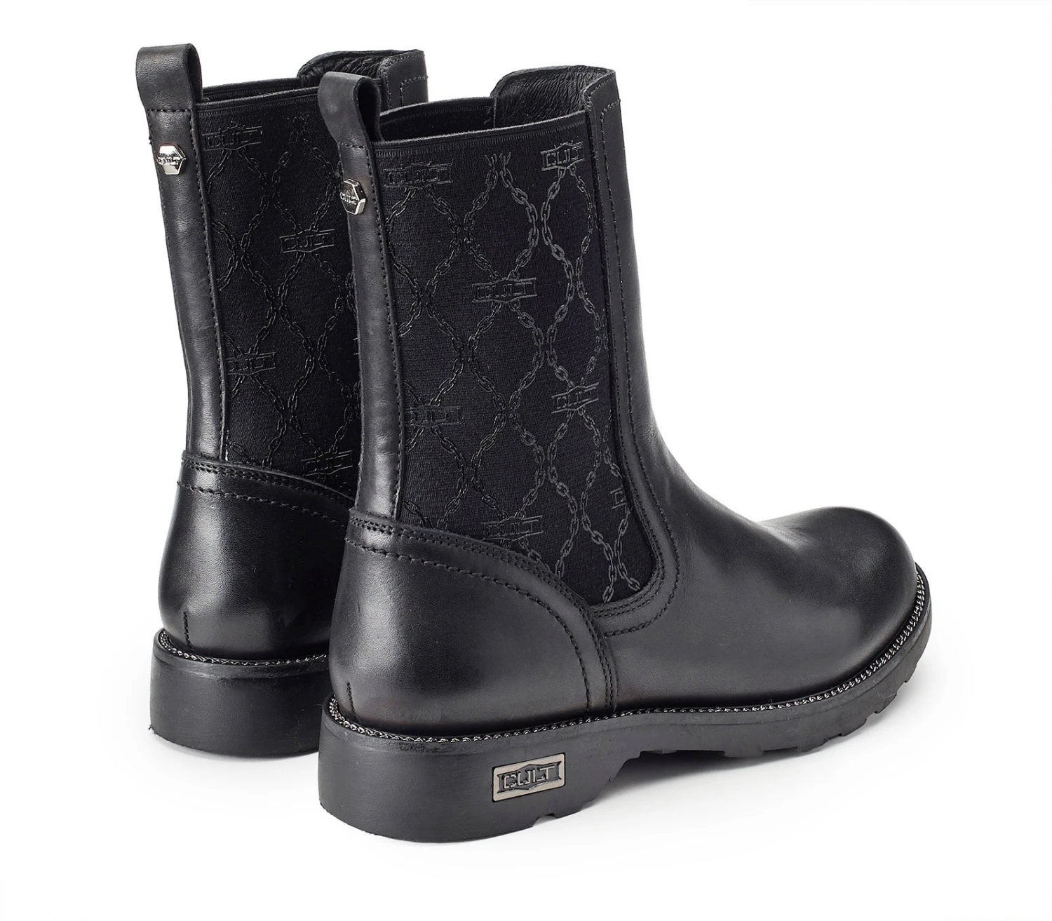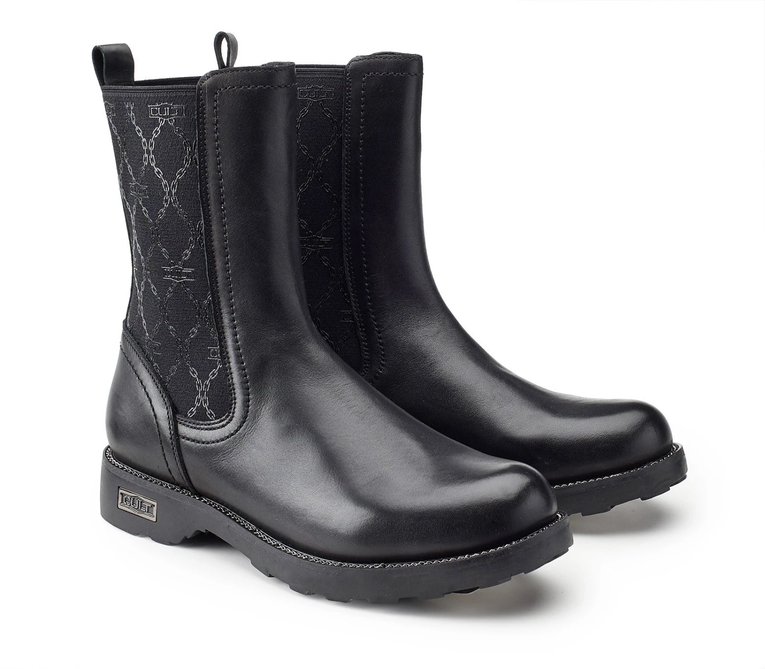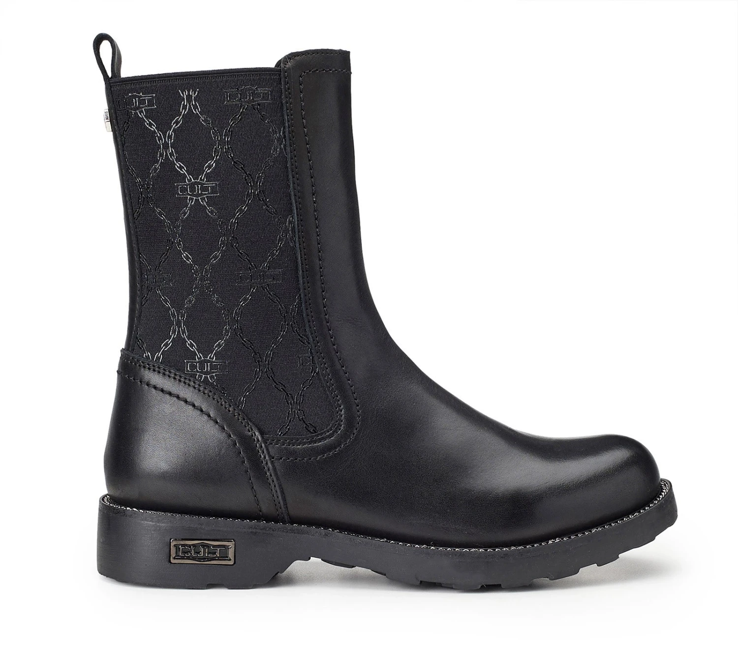Cult eleva i classici stivaletti da donna Chelsea in pelle nera e gambale scultoreo, ideale con lunghezze cropped. Il modello è montato su suole carrarmato e rifinito con l’iconico guardolo zip e targhetta metallica. Gli inserti laterali elasticizzati impreziositi con la stampa spessorata shiny all-over con pattern catena, rendono la calzata più comoda.