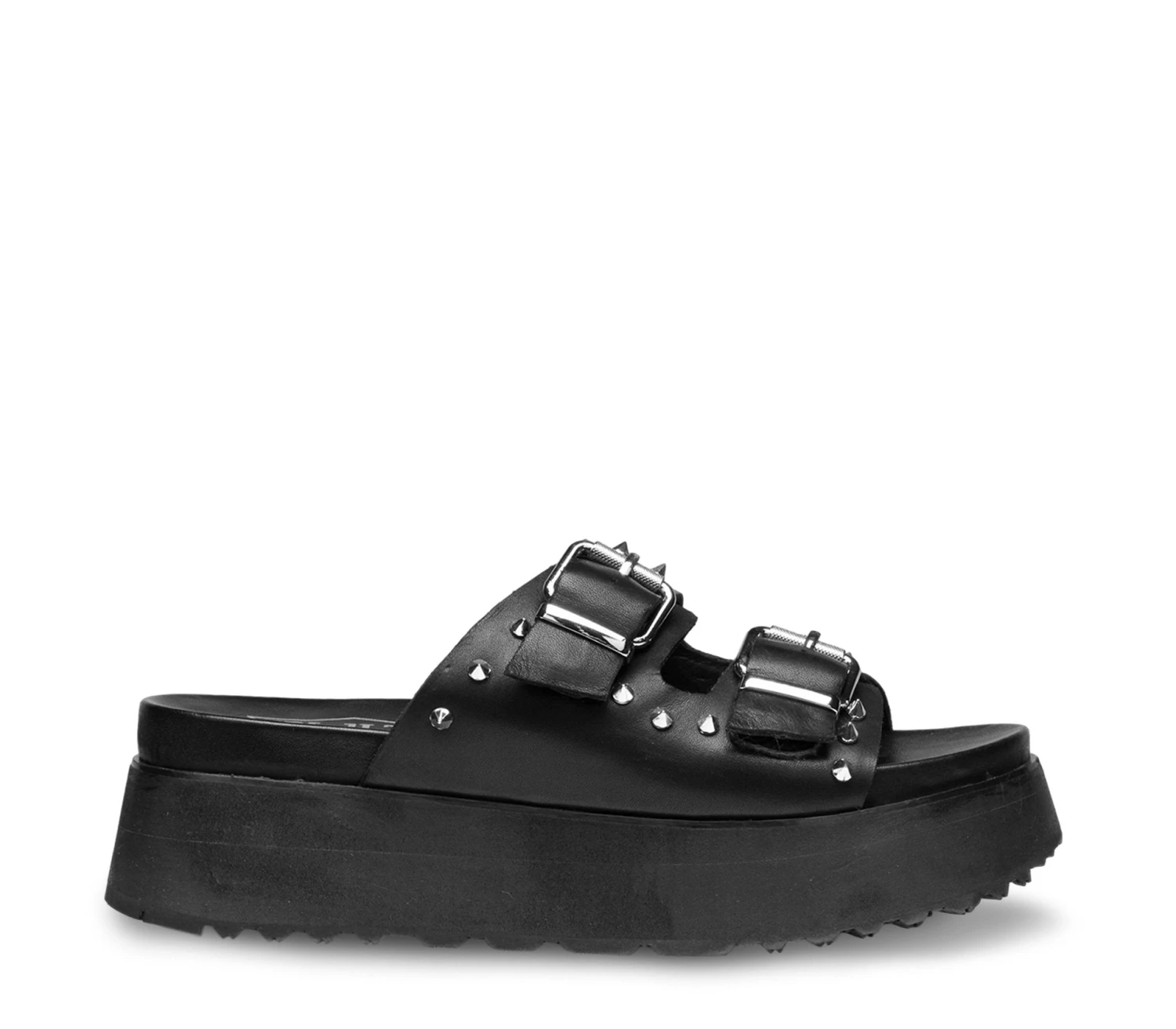 Attuali ma senza mai rinunciare alla propria anima rock questi sandali firmati Cult per l’estate 2025. Due fasce in pelle nera impreziosite da fibbie e borchie spike in metallo e suola platform per questi sandali da abbinare ad ogni outfit per un tocco decisamente glam rock.