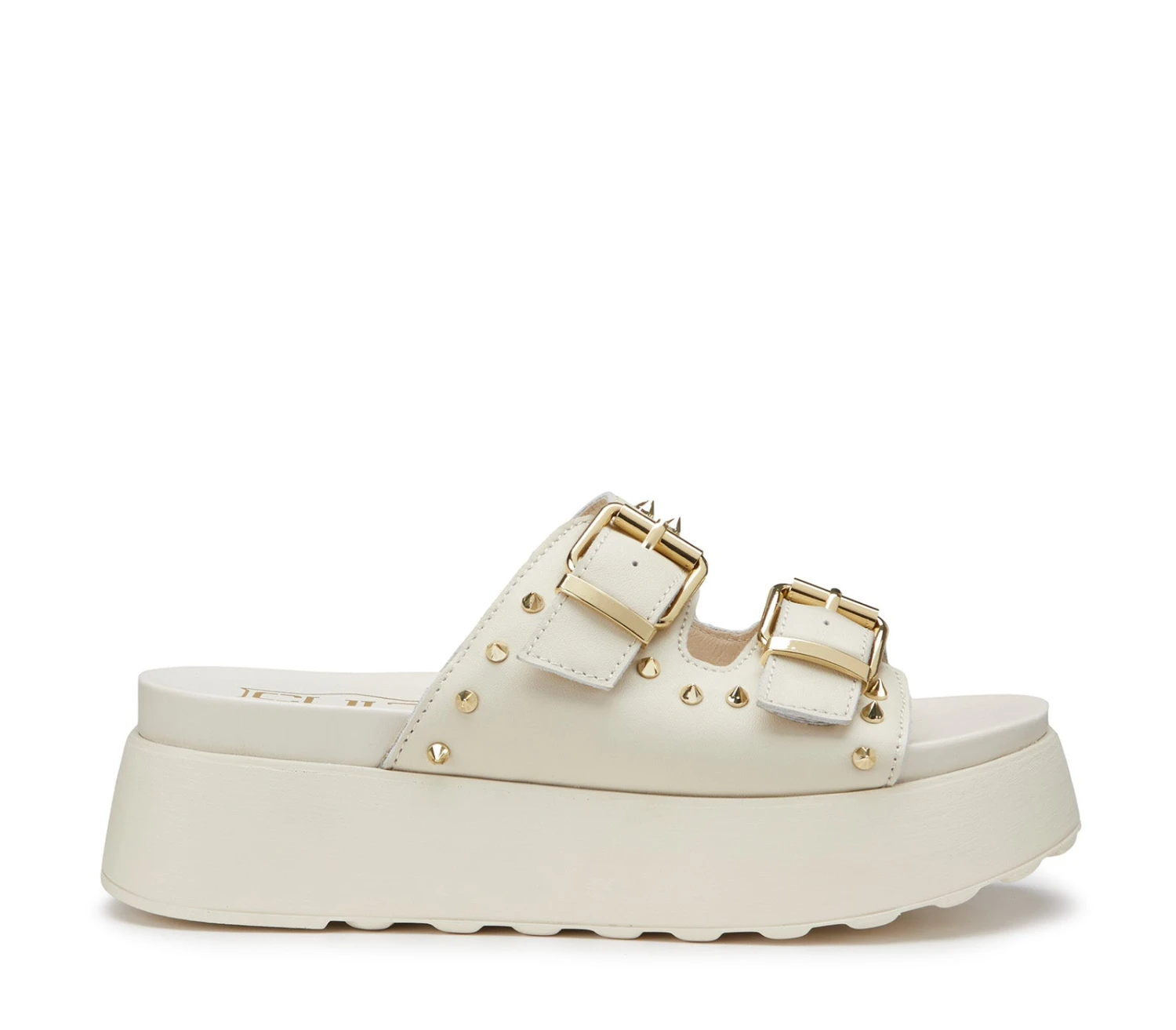 Trendy ma senza mai rinunciare alla propria anima rock questi nuovi sandali JANIS firmati CULT per l’estate 2025. Due fasce in pelle impreziosite da fibbie e borchie di metallo color oro, presentano una suola platform con altezza 6.5cm. Perfetti da abbinare a ogni outfit estivo per un tocco indiscutibilmente glam-rock.