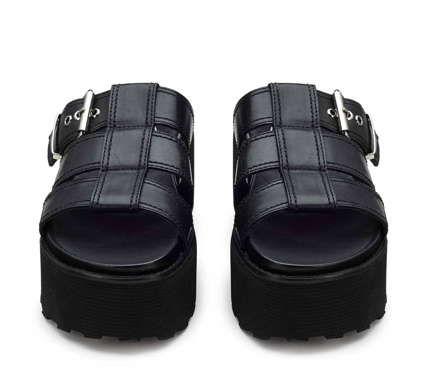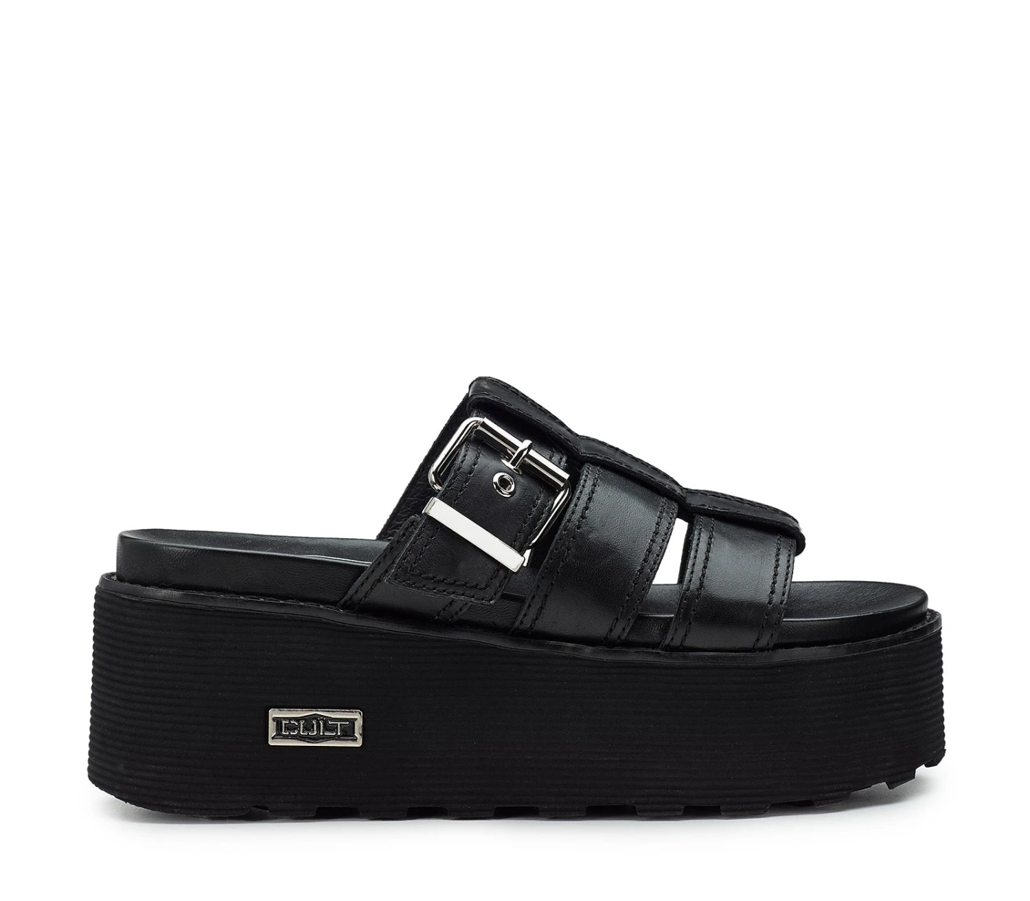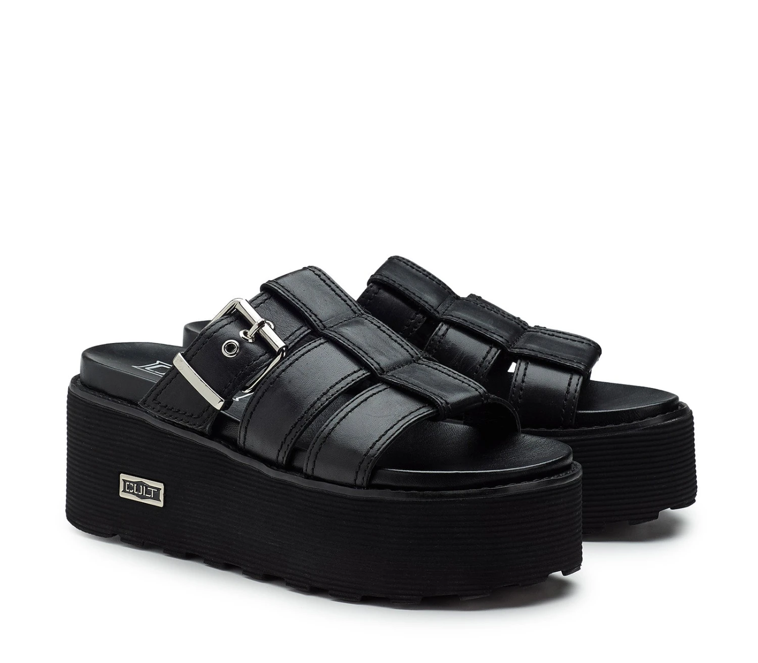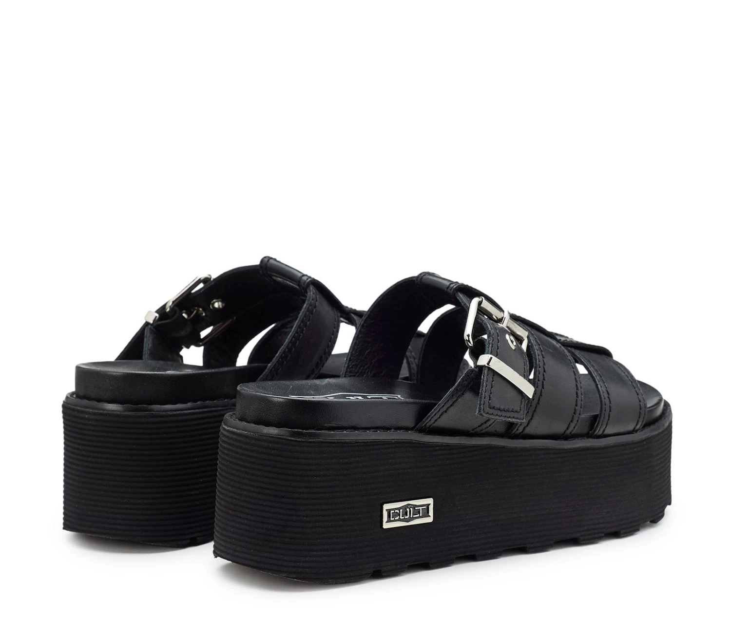 Per questa stagione optate per i sandali firmati Cult realizzati in pelle nera con leggero platform in gomma, presentano cinturini tre spesse fasce rifiniti con fibbia metallica. Abbinateli facilmente a tutto il vostro guardaroba estivo.