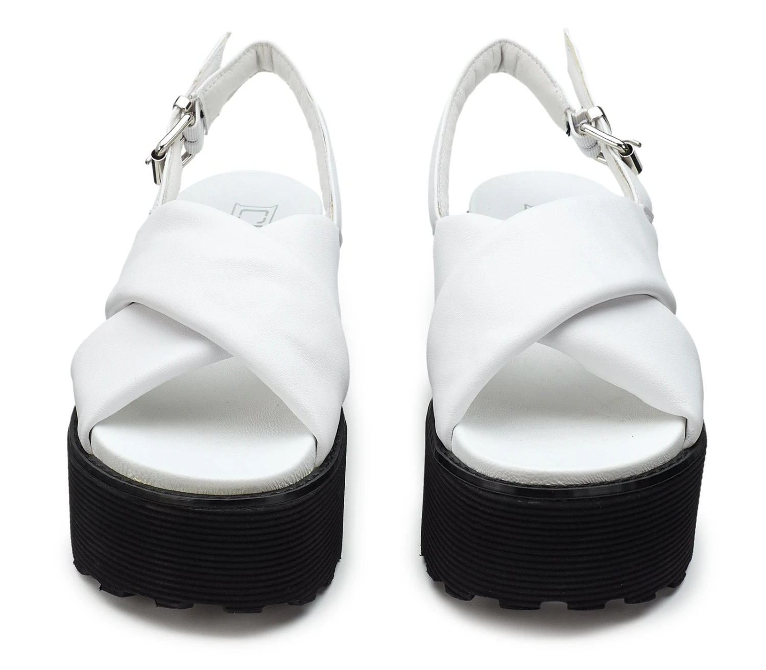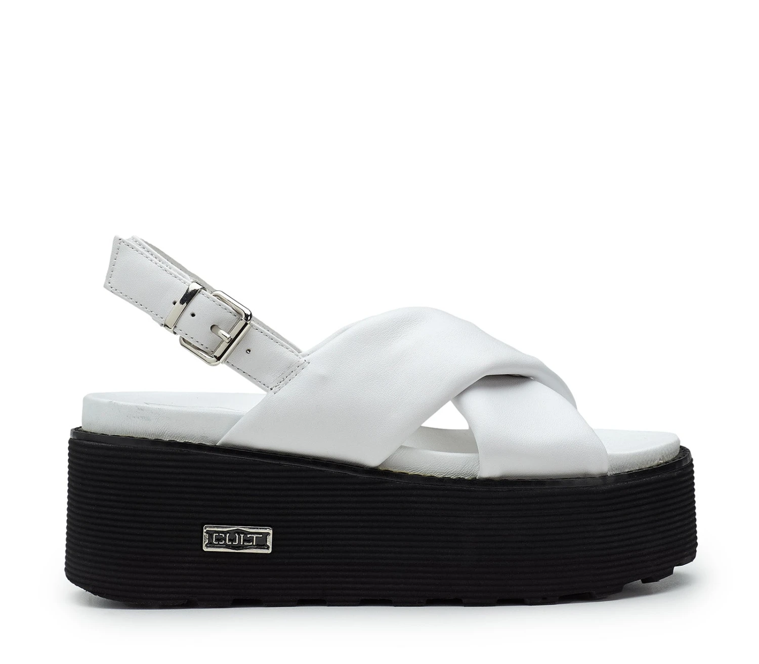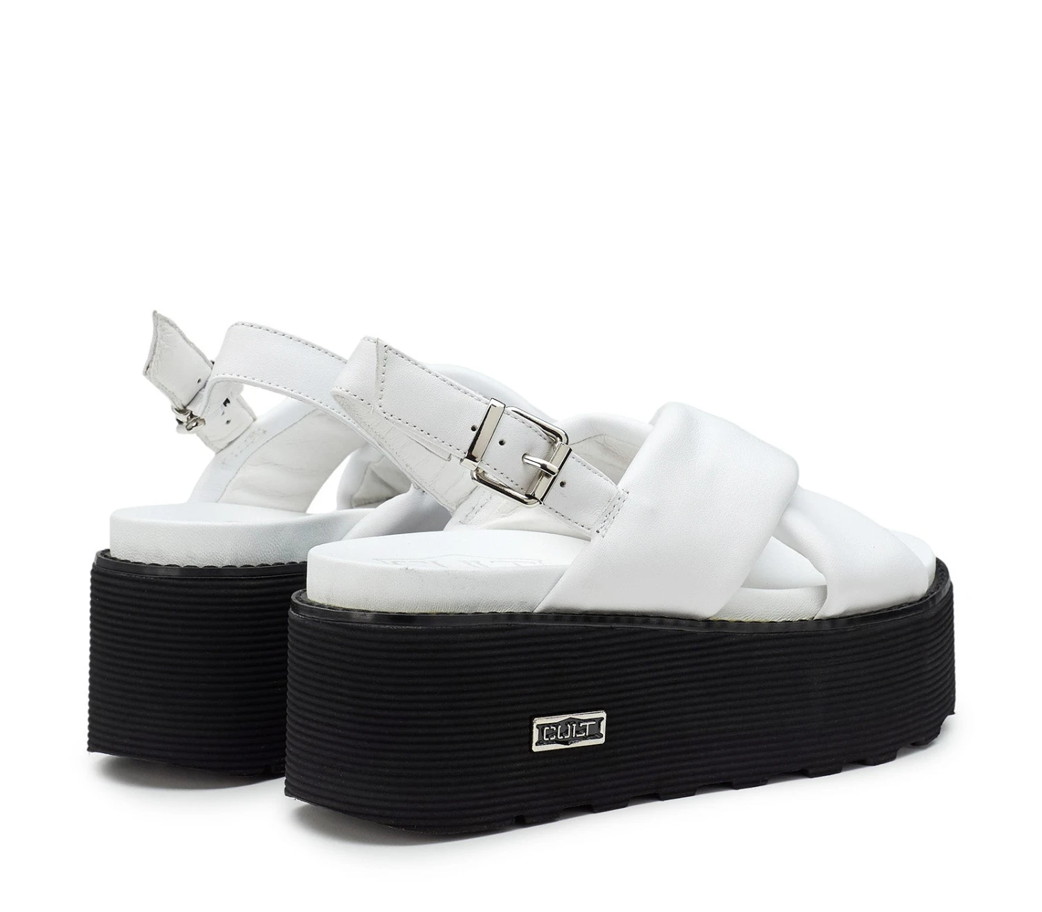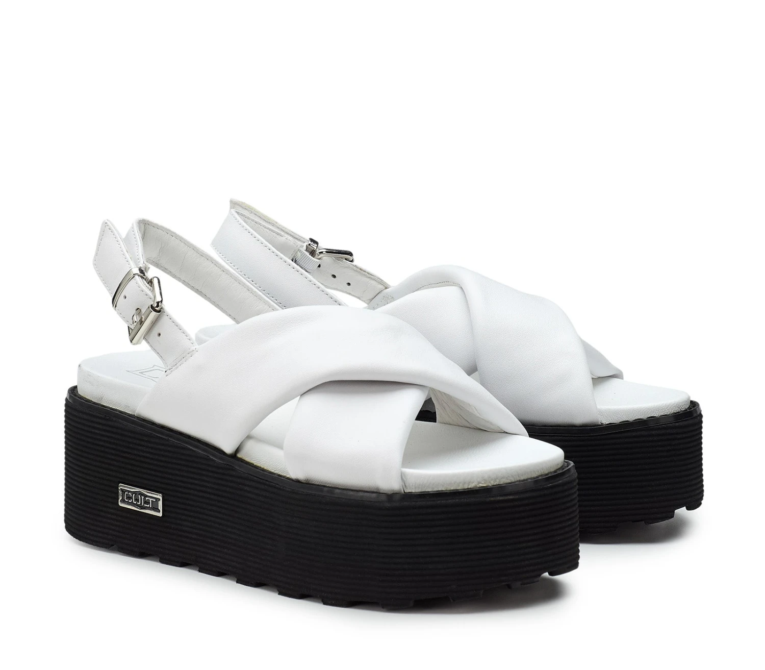 Definiti da due ampie fasce incrociate imbottite, i sandali con platform firmati Cult aggiungeranno un pizzico di volume anche agli outfit più minimali. Realizzati in morbida pelle, presentano uno chiusura con fibbia e inconfondibile traghetta con il logo metallico sulla parte esterna della suola.