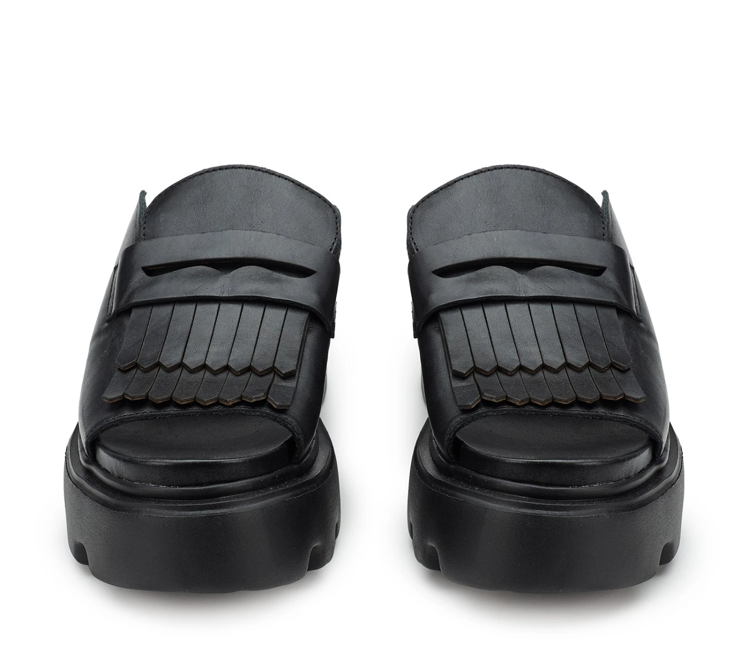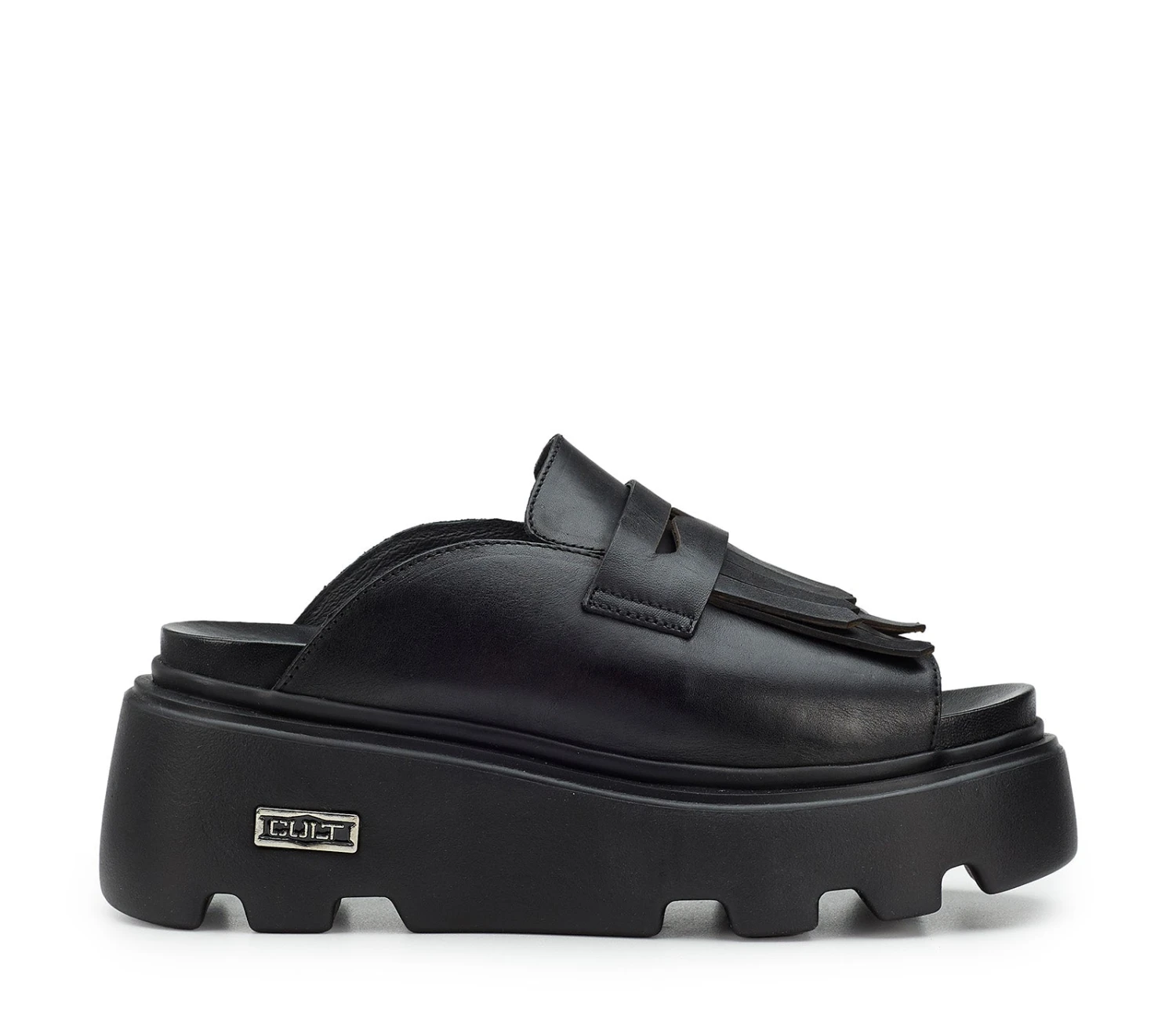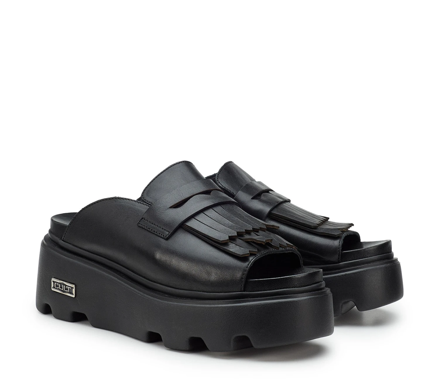 Cult fonde le silhouette dei sandali con quelle dei mocassini per creare questi comodi slingback platform con la punta aperta tonda. Questo modello presenta un’ampia tomaia in pelle nera con la classica mascherina e frange e poggia sulle iconiche suole scanalate.