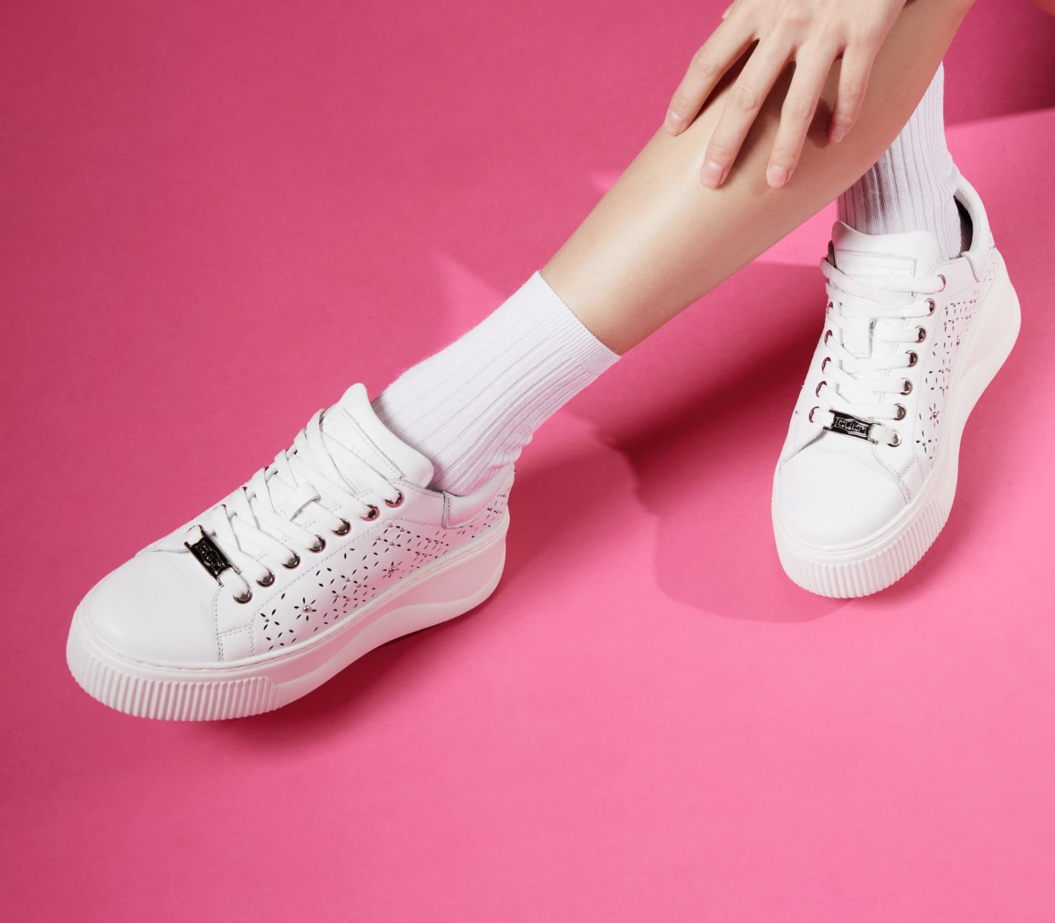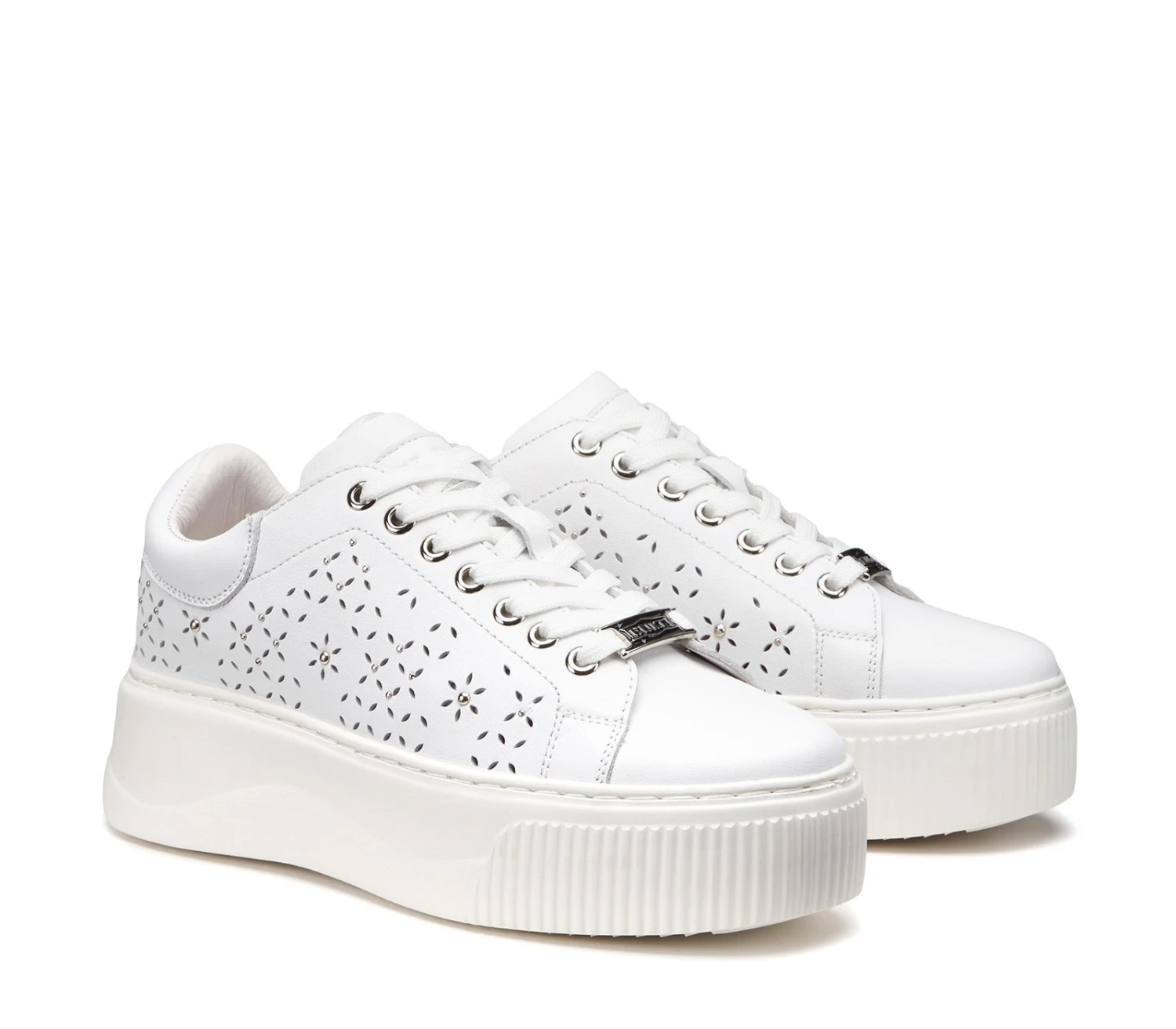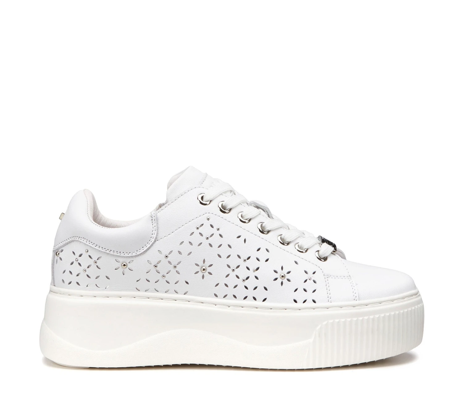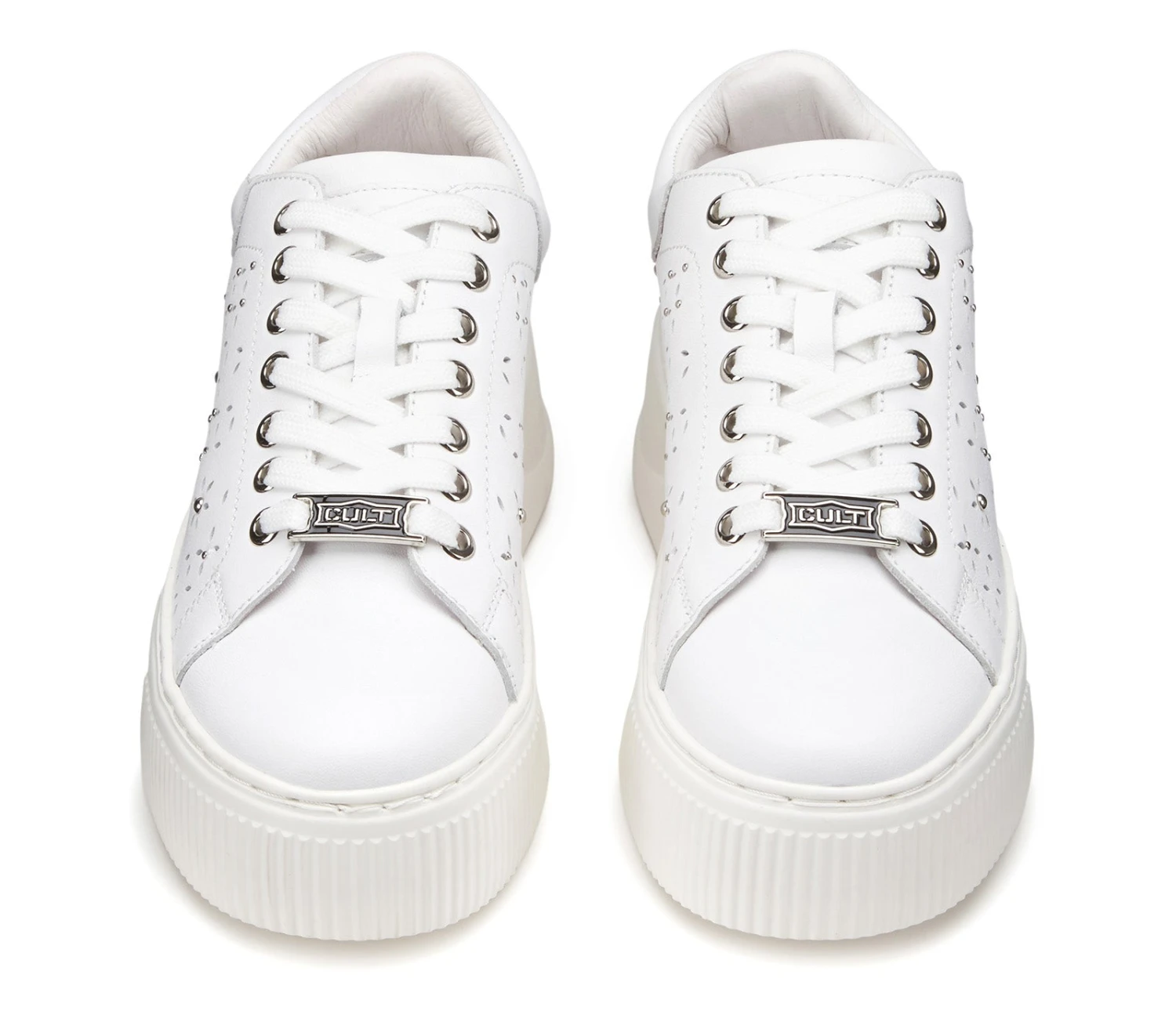 Total white per le sneakers in pelle firmate Cult per questa primavera estate. Lacci sur ton e forature floreali, gentili e femminili per un effetto davvero glamour. La loro silhouette offre infinite possibilità di abbinamento. Altezza suola 5,3cm