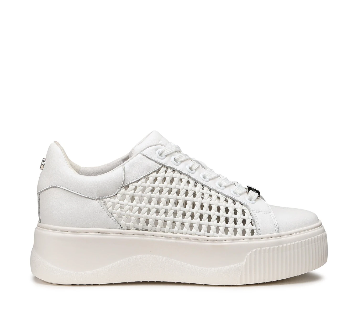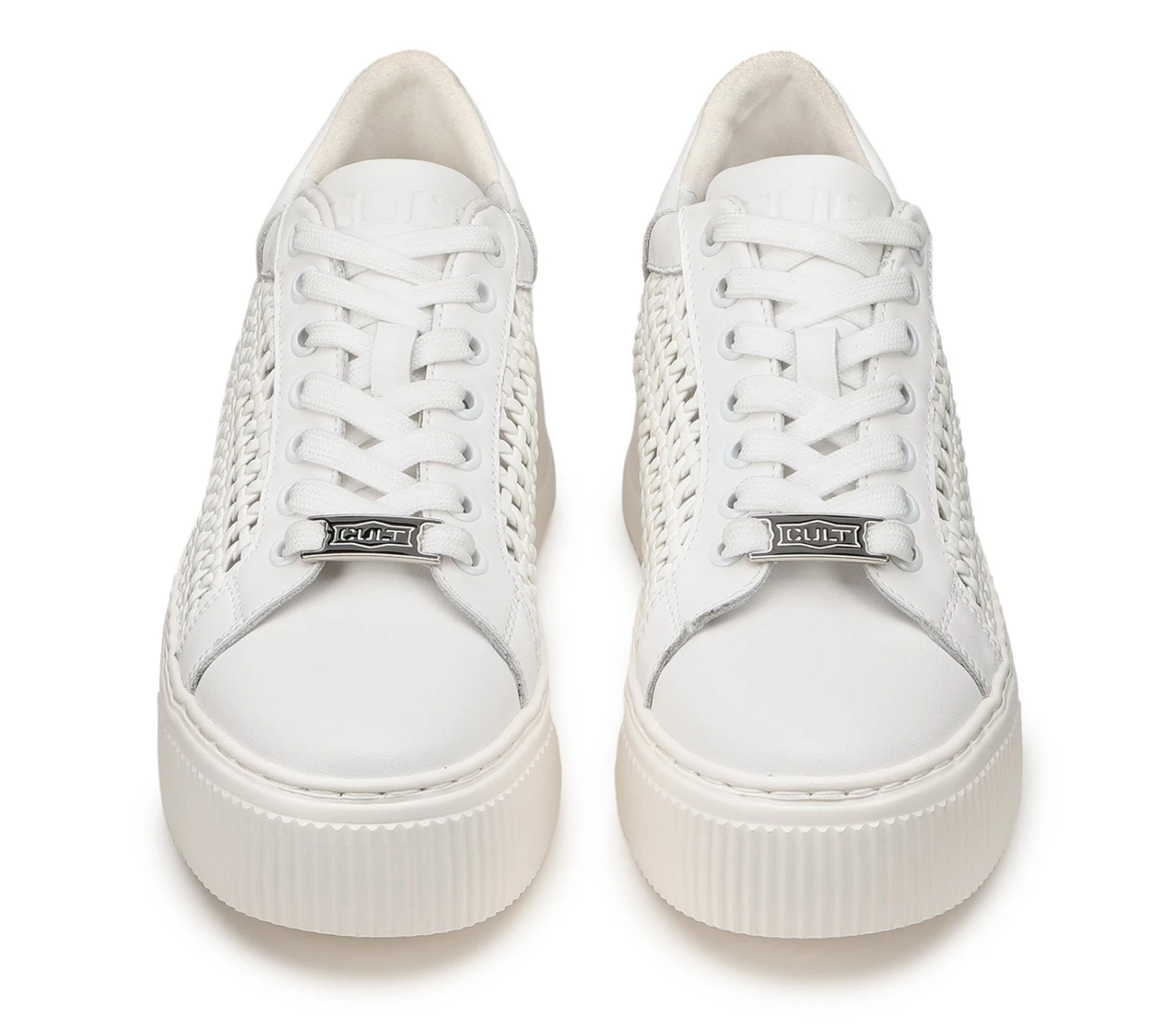 Total white per le sneakers in pelle bianca firmate Cult per questa primavera estate. Lacci sur ton e la tomaia effetto intreccio conferiscono alla scarpa un aspetto davvero glamour. Da indossare sotto un vestito slim e blazer per un mix moderno e d’effetto. Altezza suola 5,3cm