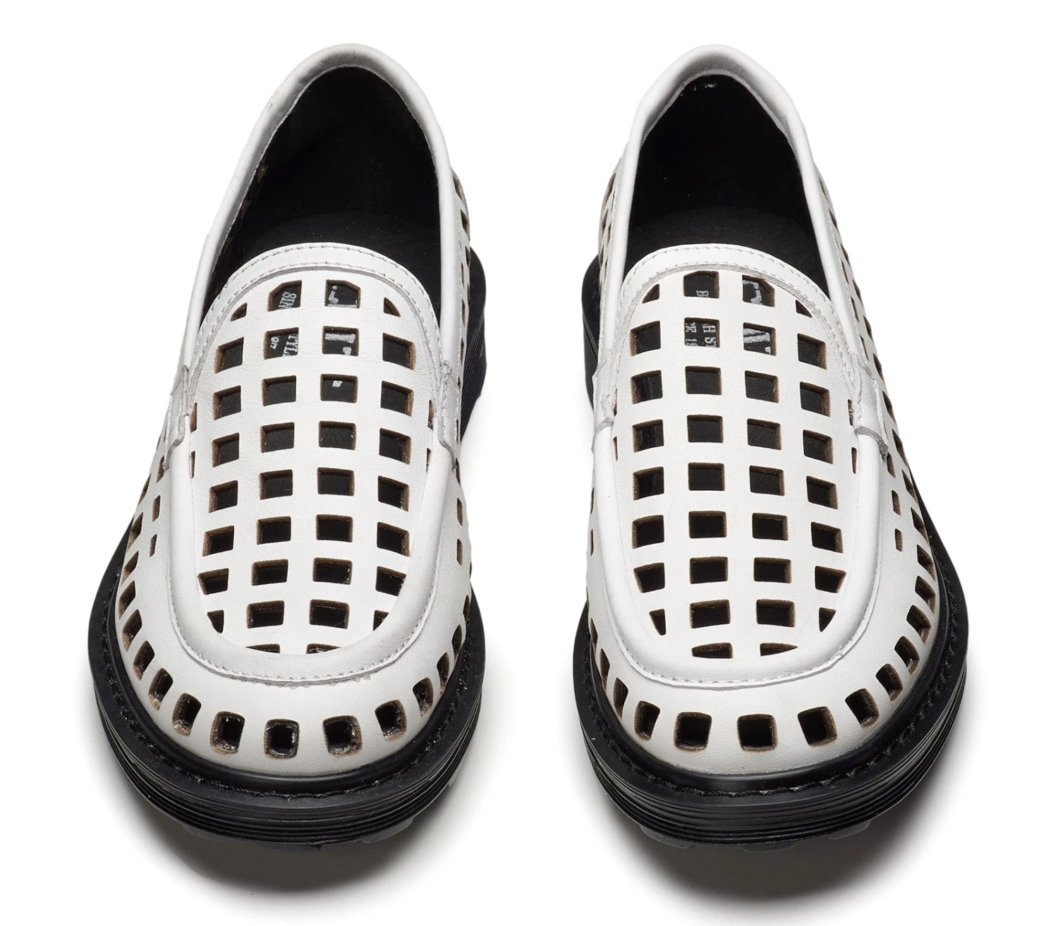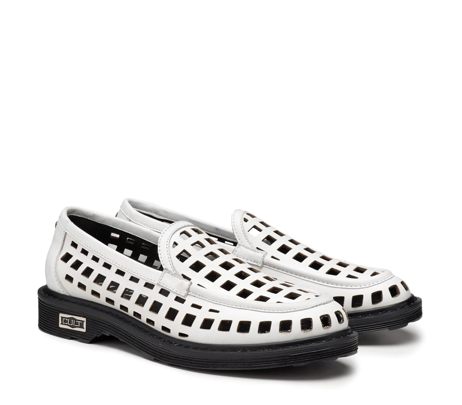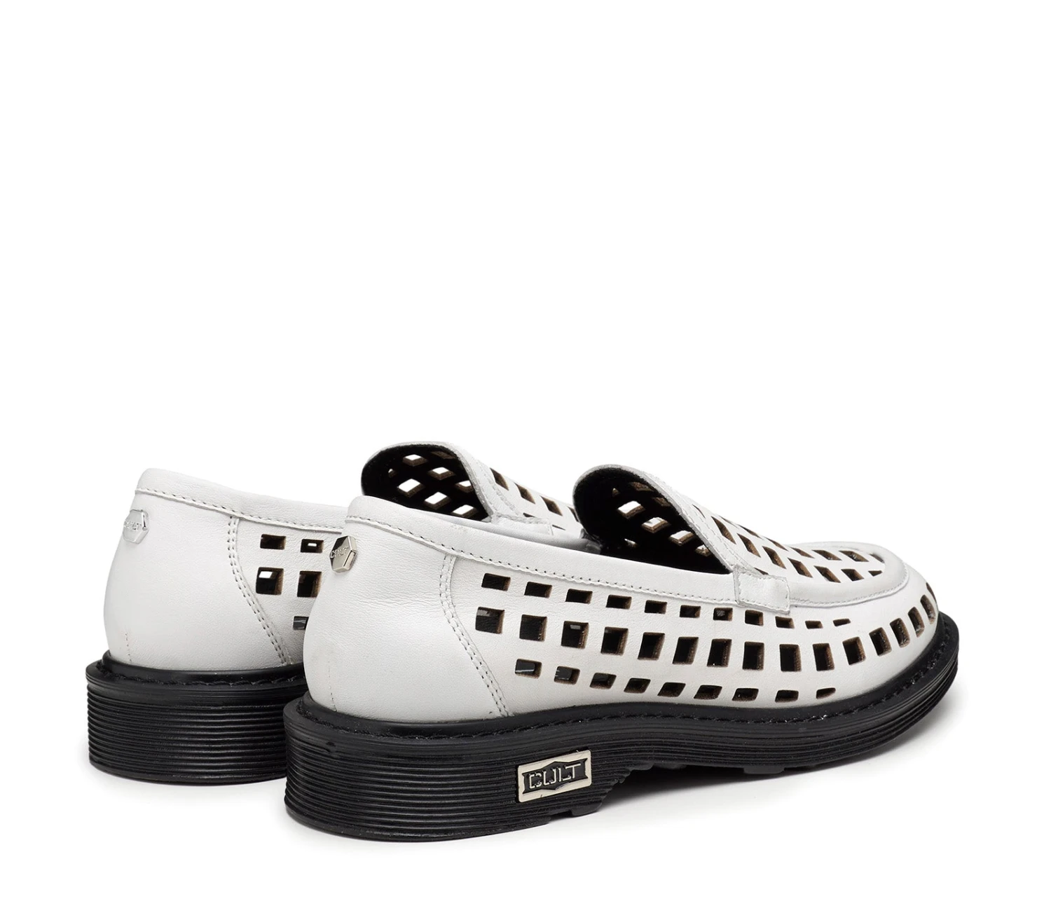 Intramontabili queste slip on della linea Slash firmati da Cult per questa estate. In pelle bianca con tomaia traforata, questi mocassini sono un must di questa stagione. Da indossare sotto gonne o pantaloni per un look rock chic. Tacco 3cm