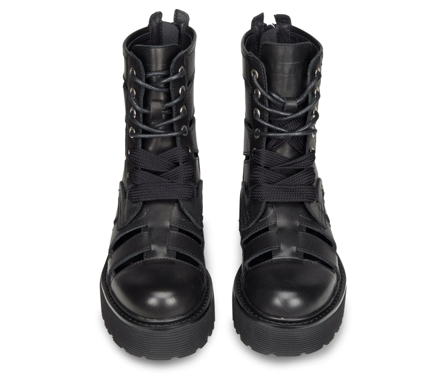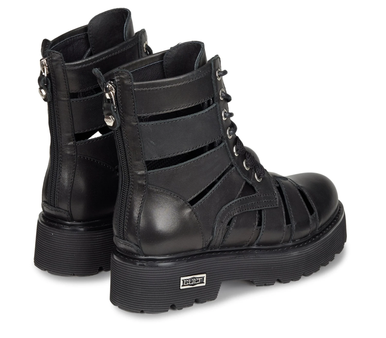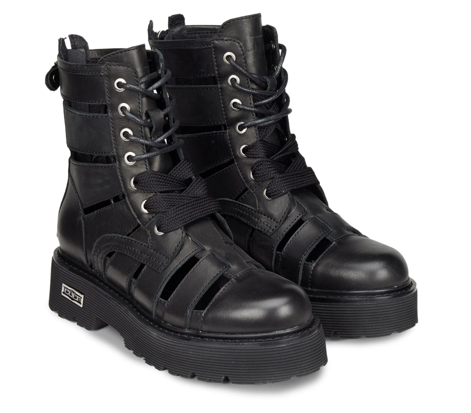Rock e combattivi questi anfibi della famiglia Slash firmati Cult realizzati in pelle nera. Suola importante, chiusura tramite stringhe su occhielli silver e aperture sul collo e sul dorso del piede per un effetto ancora più femminile e grintoso. Altezza suola 5cm