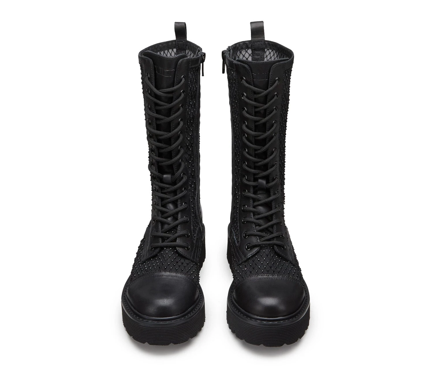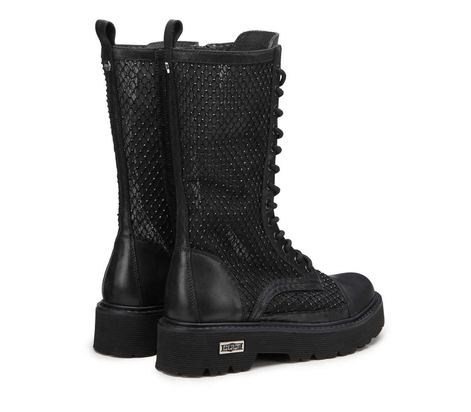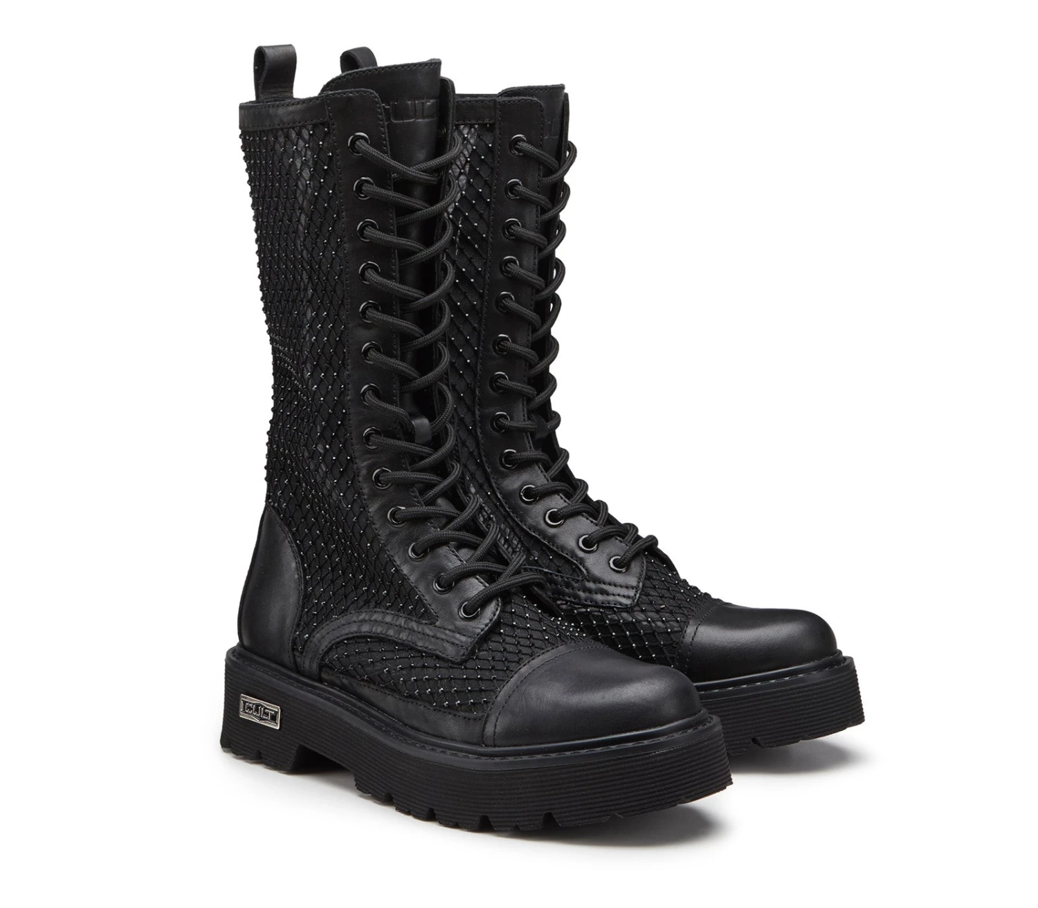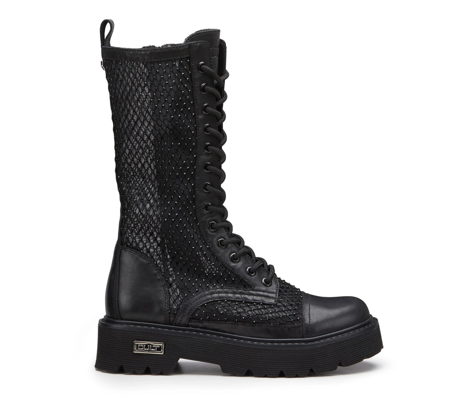 Originali ma dalla fortissima anima rock questi anfibi in pelle nera firmati Cult per questa primavera estate. La rete strass del gambale sfoderato li rende una scarpa gioiello adatta anche alle grandi occasioni, conferendo un tocco di originalità ai vostri outfit. Chiusura tramite stringhe e zip laterale, altezza suola 5cm