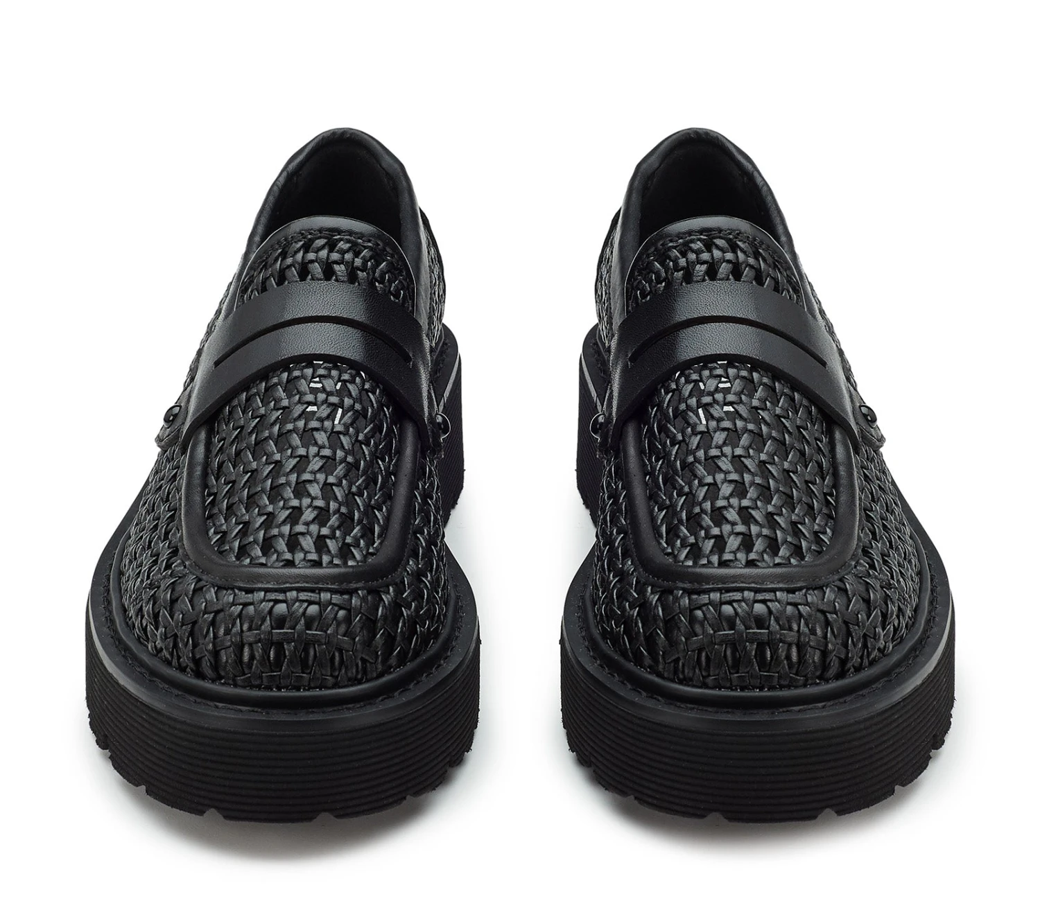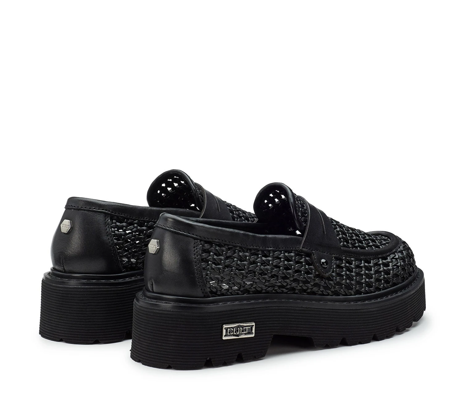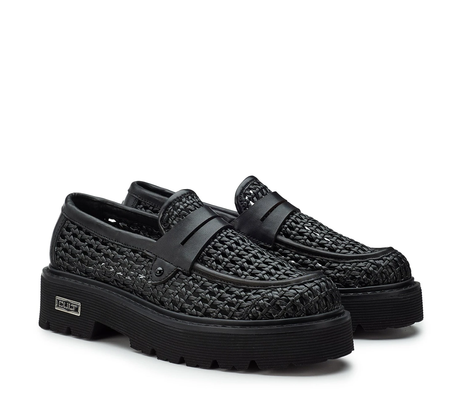 Questo mocassino da donna firmato Cult esprime un’attitudine audace e decisa che aggiorna il guardaroba urbano. Proposto in pelle intrecciata, presenta una classica mascherina sulla tomaia e si caratterizza per il design robusto con suola over in EVA carrarmato personalizzata con l’iconica targhetta metallica.
